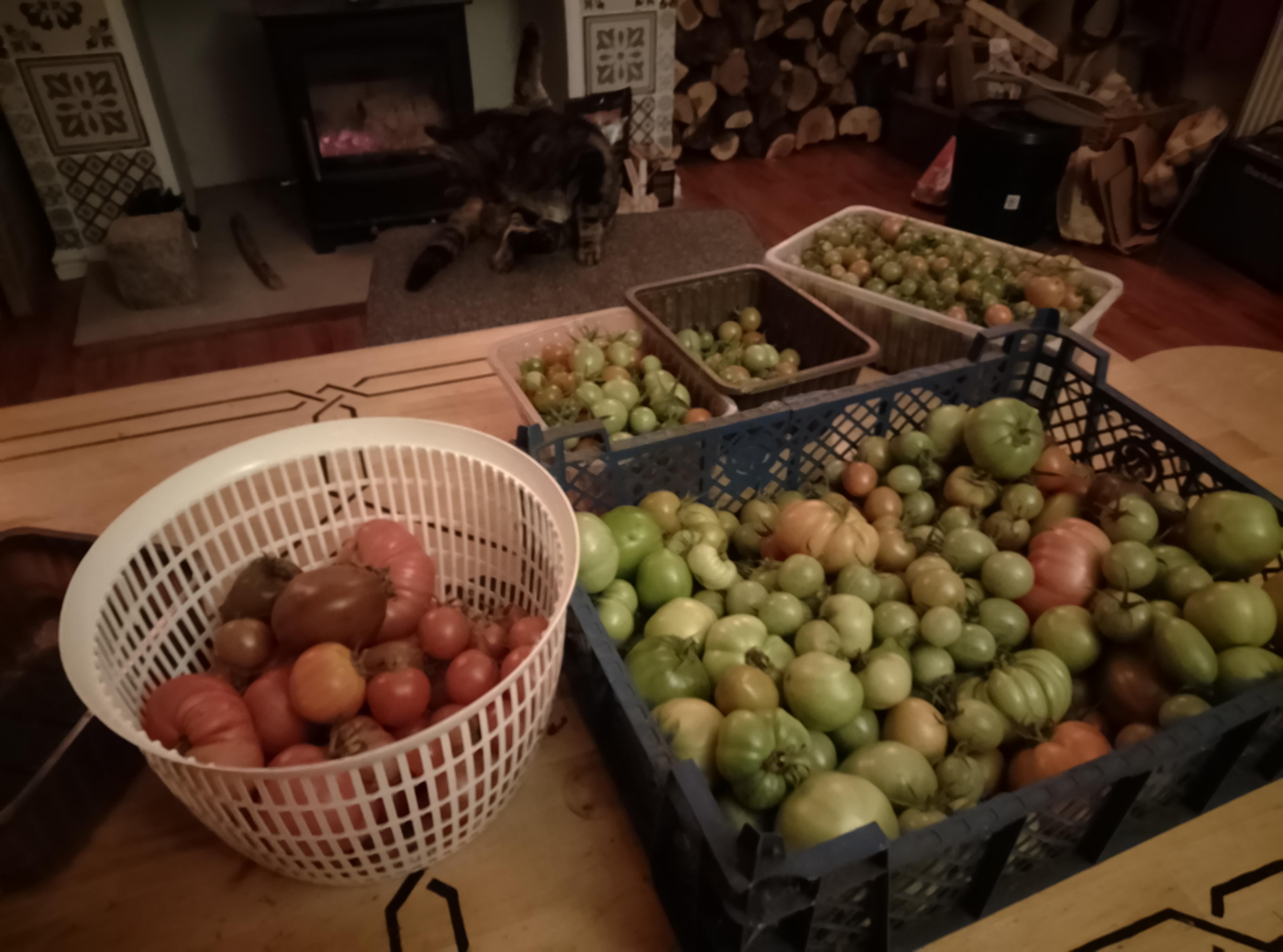 Da die Pflanzen Anzeichen von Fäulnis zeigten, wurde heute der Folientunnel geräumt und der Rest geerntet. Insgesamt sind wir mit der diesjährigen Saison sehr zufrieden, wir entfernen die Tomaten normalerweise etwa zwei Wochen früher. Von: Wytyujjju