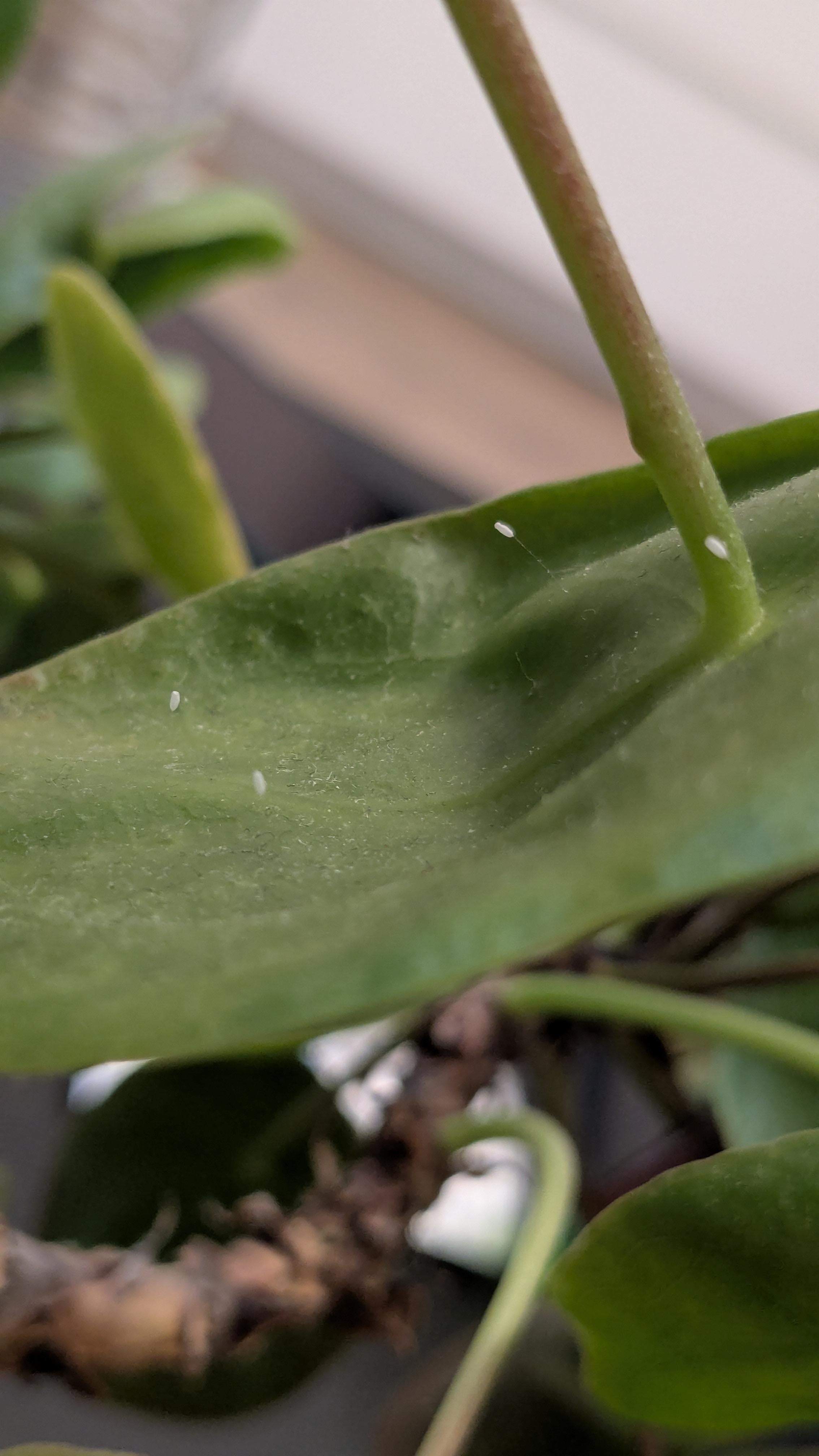 Sieht aus wie Eier, die aufgespiest wurden. Die "sprießen" an ein paar Stellen heraus. Habe erst an Spinnmilben gedacht aber sonst sind keine Gespinste an der Pflanze.