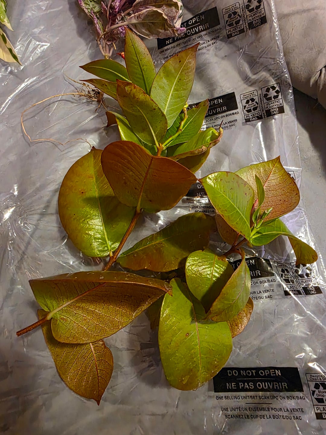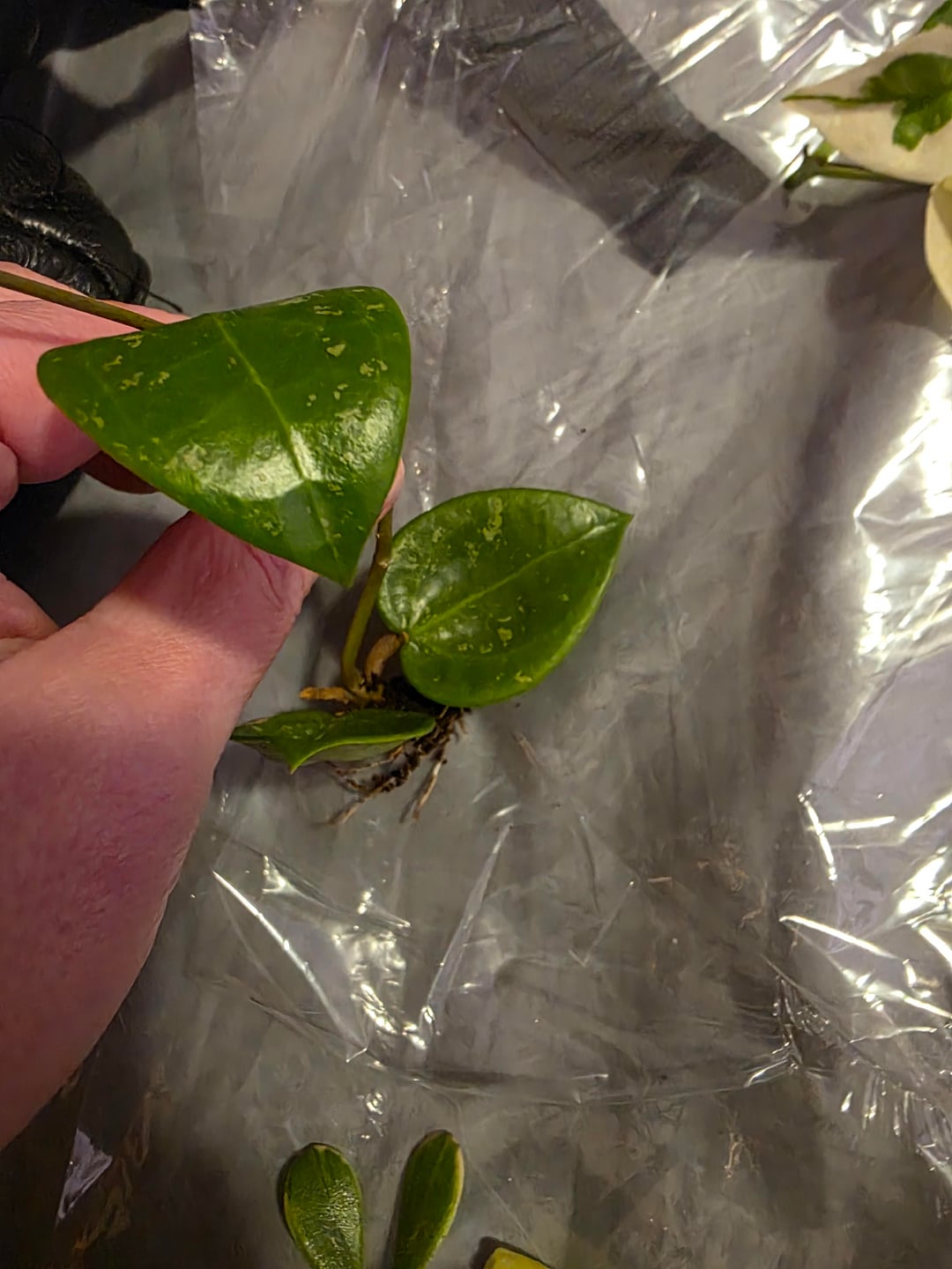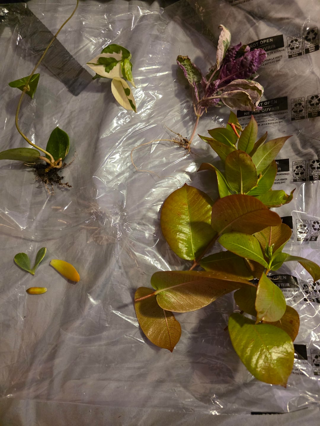 Das war erstaunlich. Ich war im Home Depot und suchte nach einem Weihnachtskaktus, und die Frau von ihrem Lieferanten, Hampshire Farms, war dort. Sie hatte einen ganzen Wagen voller Wegwerfpflanzen. Meistens absolut zu retten, aber die Unternehmensrichtlinien besagen, dass sie weggeworfen werden, wenn sie nicht mehr gut aussehen. Ich sagte, es sei schade, dass wir keine Stecklinge nehmen könnten. Sie sagte, dass es ihnen nicht erlaubt sei, sie wegzugeben, aber die Regeln sagen nichts über Stecklinge aus. Sie holte mir sogar eine Schere. Bei einigen davon sahen nur kleine Teile noch anständig aus, und sie half mir, die Wurzeln herauszubekommen. Sie hat sicher die Regeln missachtet, aber das macht sie einfach großartig. Weiß jemand, was dieser große grüne und rötliche Steckling ist?