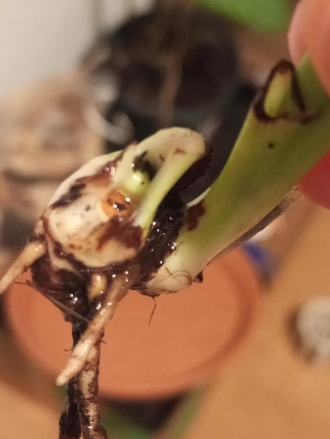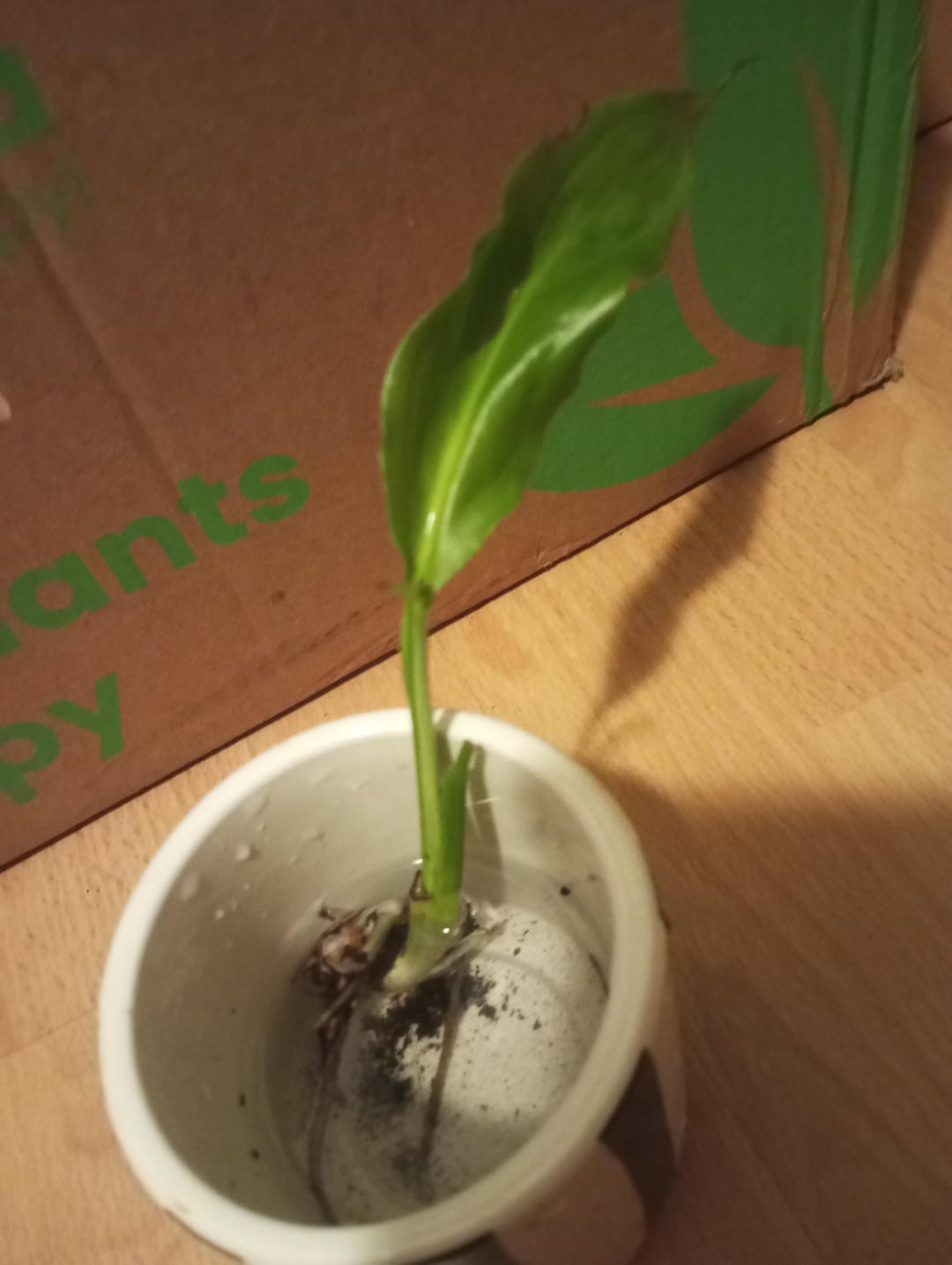 Jemand ließ seine Friedenslilie draußen, als die Temperatur fast unter dem Gefrierpunkt lag und die Pflanze absterbte, also habe ich einen der Welpen gebrochen, weil sie mir leid tat. Zweiter Welpe, den ich versehentlich gebrochen habe, aber ich denke, er wird nachwachsen (zweites Foto)
