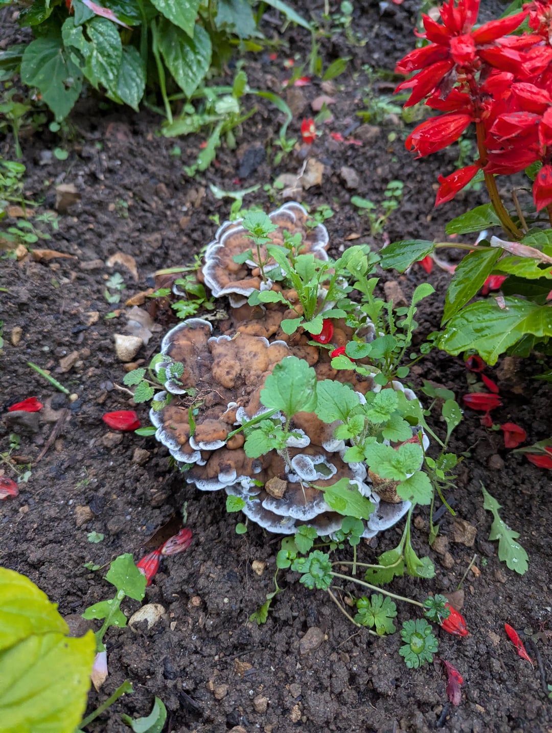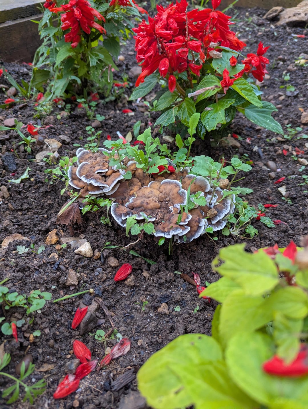 Fungi are great for the garden! This one will be breaking down the stump, helping return nutrients to the soil. It is estimated around 80% of the worlds plants thrive thanks to fungi.