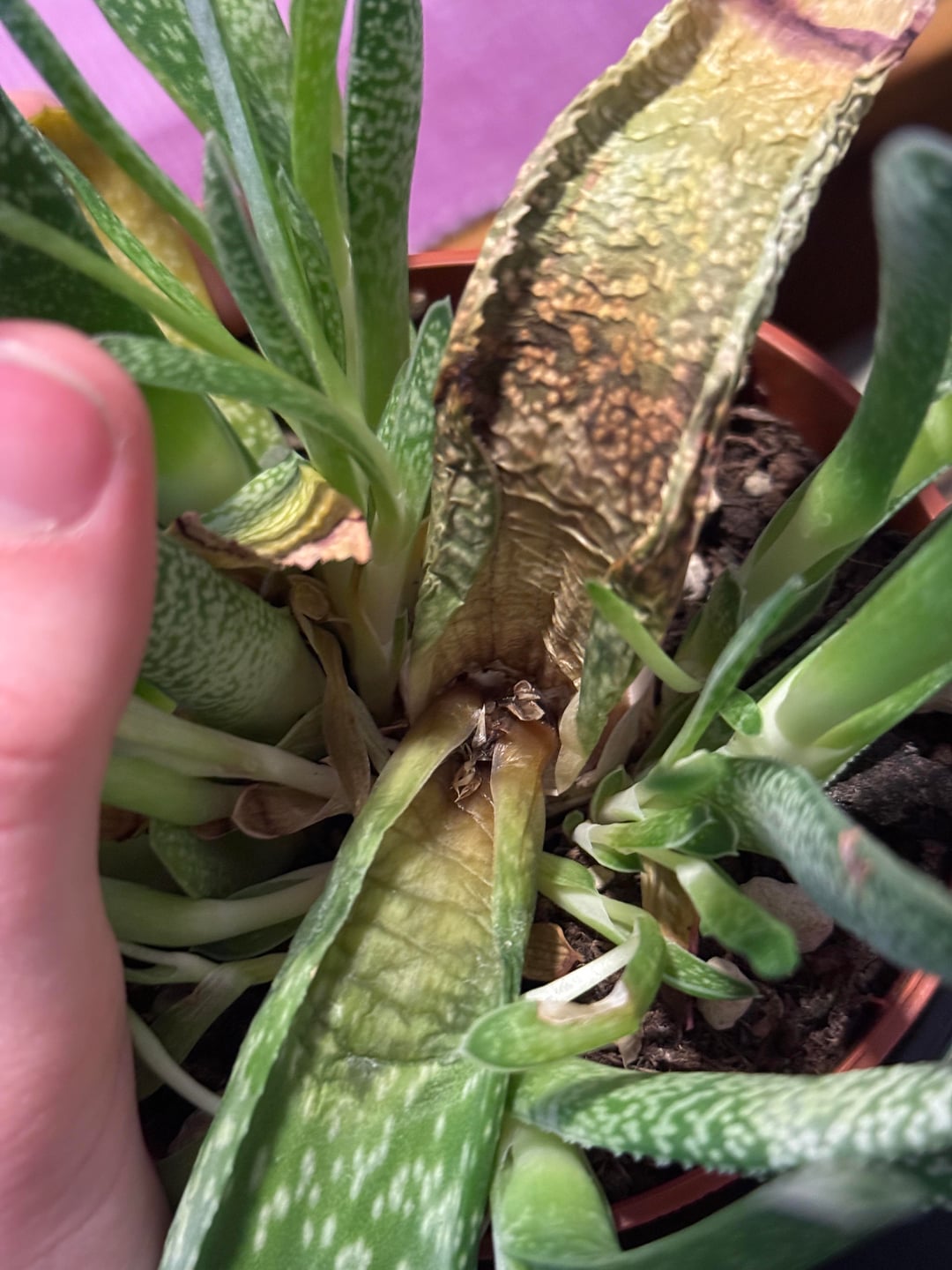 Ich war Ende Oktober für 1,5 Wochen im Urlaub und habe mir nichts dabei gedacht, weil ich schon mal im Urlaub war und meine Pflanzen das ohne Probleme überstanden haben. Als ich wiederkam habe ich alle geprüft und bei starker Trockenheit gegossen. Alle Pflanzen haben es gut überstanden, auch meine monstera und meine philodendron. Aber: Meine Gasteria hat da bereits Blätter verloren (s. Bild 1) und hatte mehrere braune Stellen. Ich habe mich in den letzten zwei Wochen sehr bemüht, ihr die beste Pflege zu bieten. Ich hatte keine weiteren Symptome wahrgenommen und es sah teilweise so aus, als würde sie sich erholen. Nun ist es in den letzten 2 Tagen zu einem drastischen Wechsel gekommen. Die großen Blätter in der Mitte haben sich massiv verändert, das eine ist vollständig vertrocknet, unten ist es aber noch etwas "wabbelig" und fällt daher nicht ab. (s. Bild 2-5) Auch das andere große Blatt fängt nun an von der Wurzel aus zu trocknen.😔