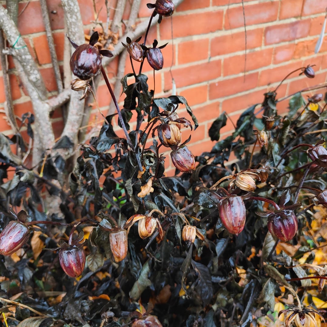 I’m in the same dilemma! You have lots of closed buds there, and (me too) despite frost, it might be worth cutting them and putting them in water indoors, as seeds may be developing in there, and you might get some really funky new varieties if you plant them next year. Nothing ventured… Dahlias are octoploid, and so the genetic diversity of ‘wild pollinated’ (or deliberately pollinated) seeds is potentially massive!