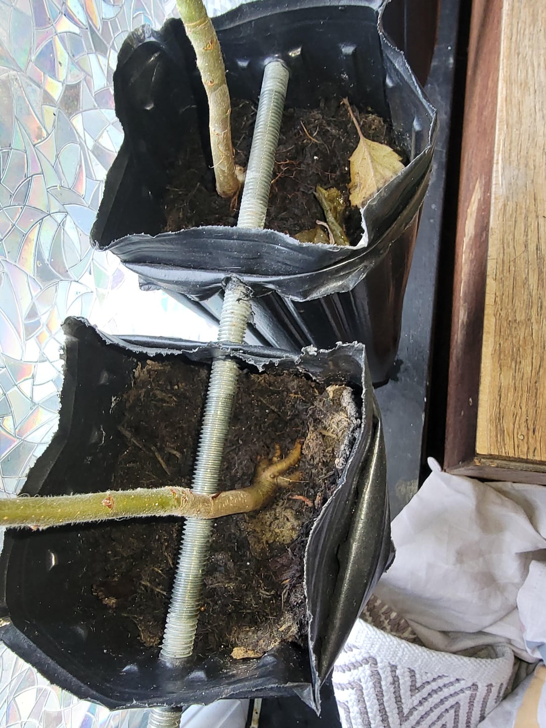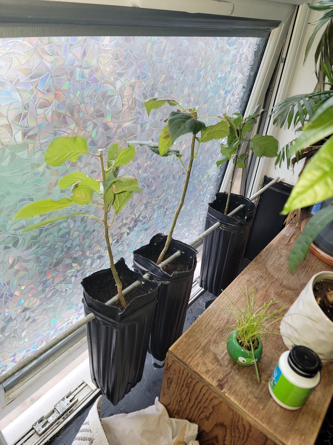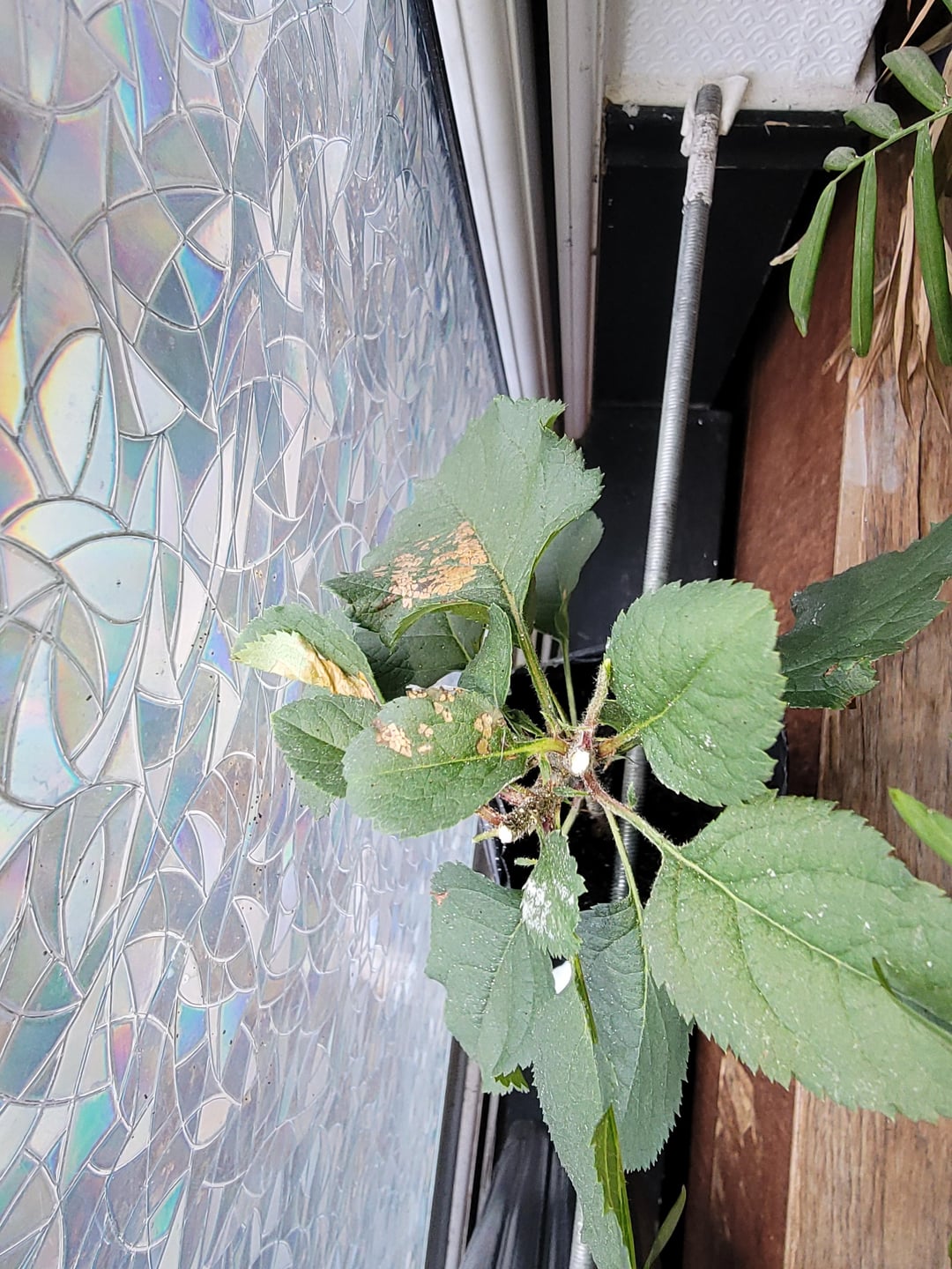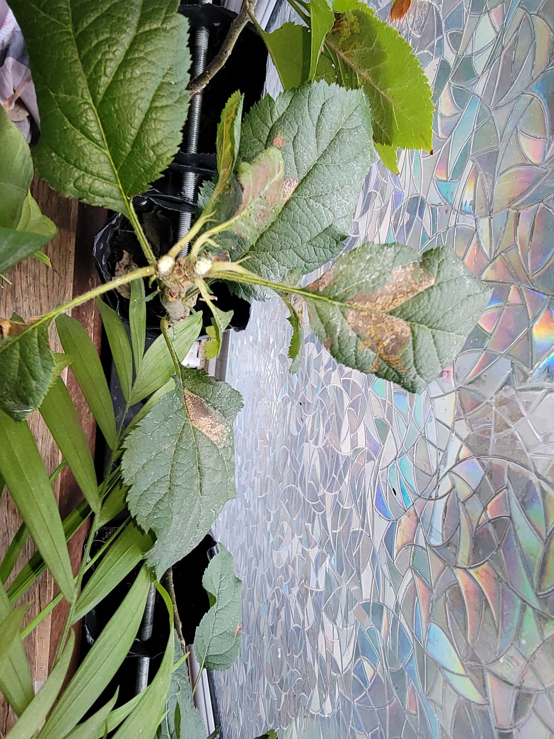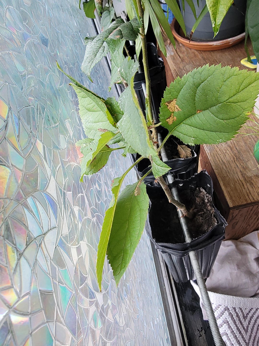 Ich versuche seit 2 Jahren, diese Äpfel drinnen anzubauen. Ich möchte, dass sie etwas stabiler werden, bevor ich sie nach draußen stelle. Den größten Teil des Tages haben sie hinter einem Fenster Sonne. Was ist mit den Blättern los? Ich füttere und gieße selten.