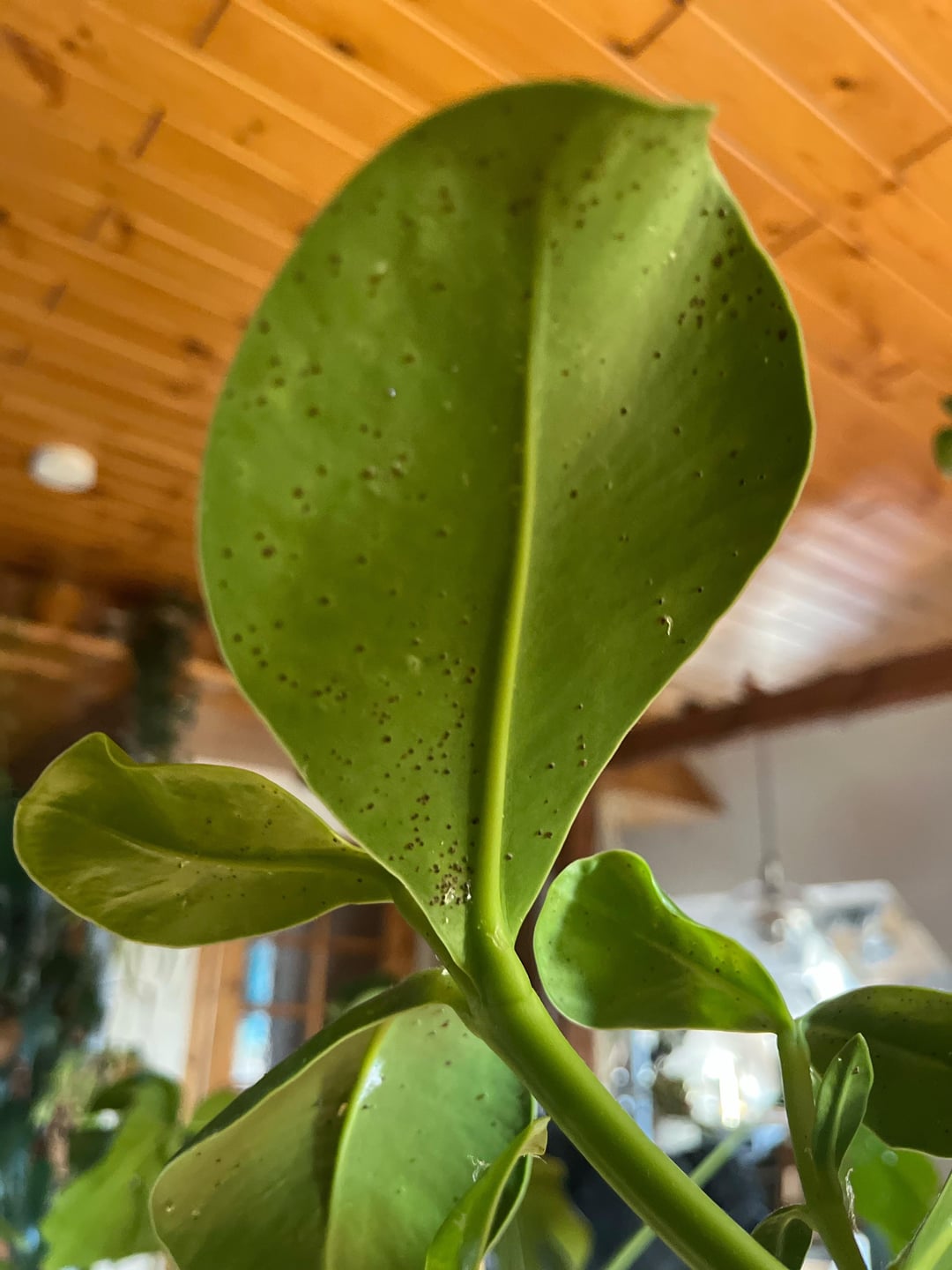 Kleine feste Punkte. Gefühlt eher im als am Blatt. Primär an den Blattunterseiten. Ich denke mal da hat sich jemand eingenistet 😬 die größeren kaputten Stellen sind tendenziell in der Nähe des Befalls aber nicht unbedingt nur an den Blättern. Hier und da sind auch klebrige Stellen, da denke ich als Laie erstmal irgendwie an Läuse.