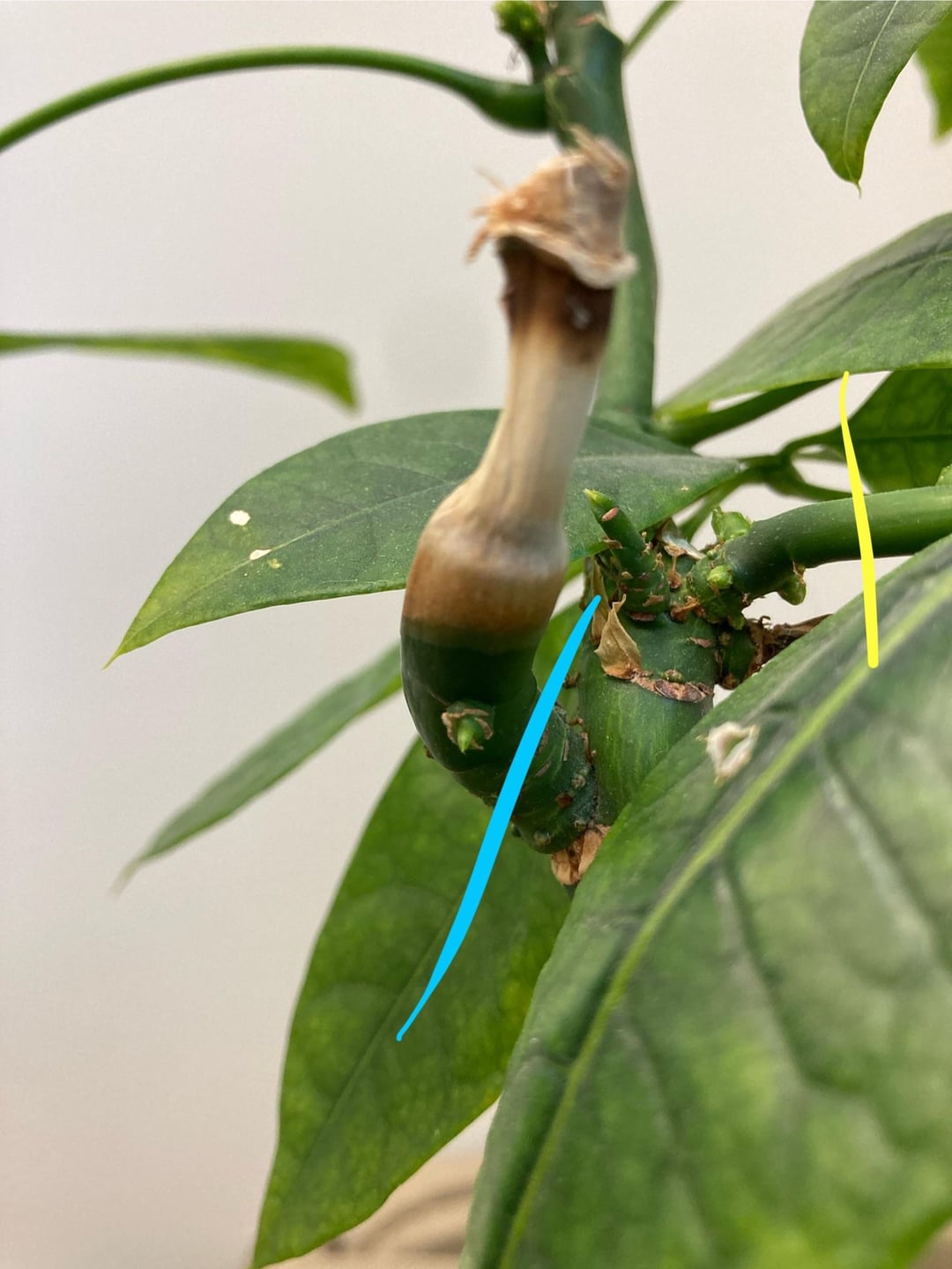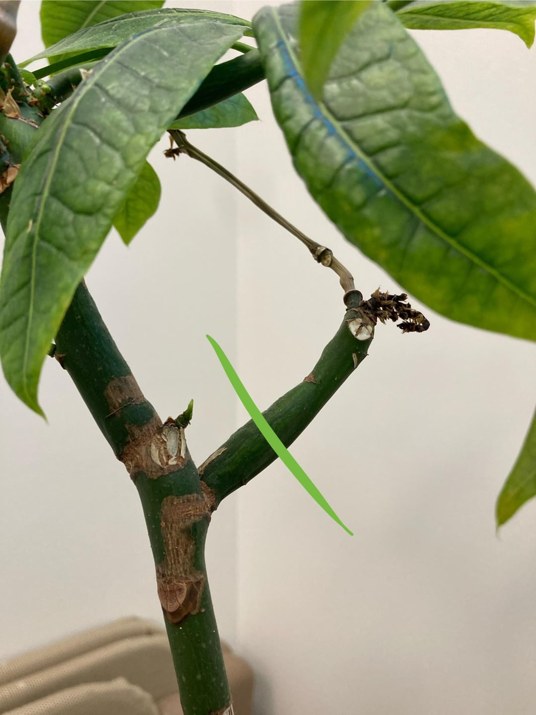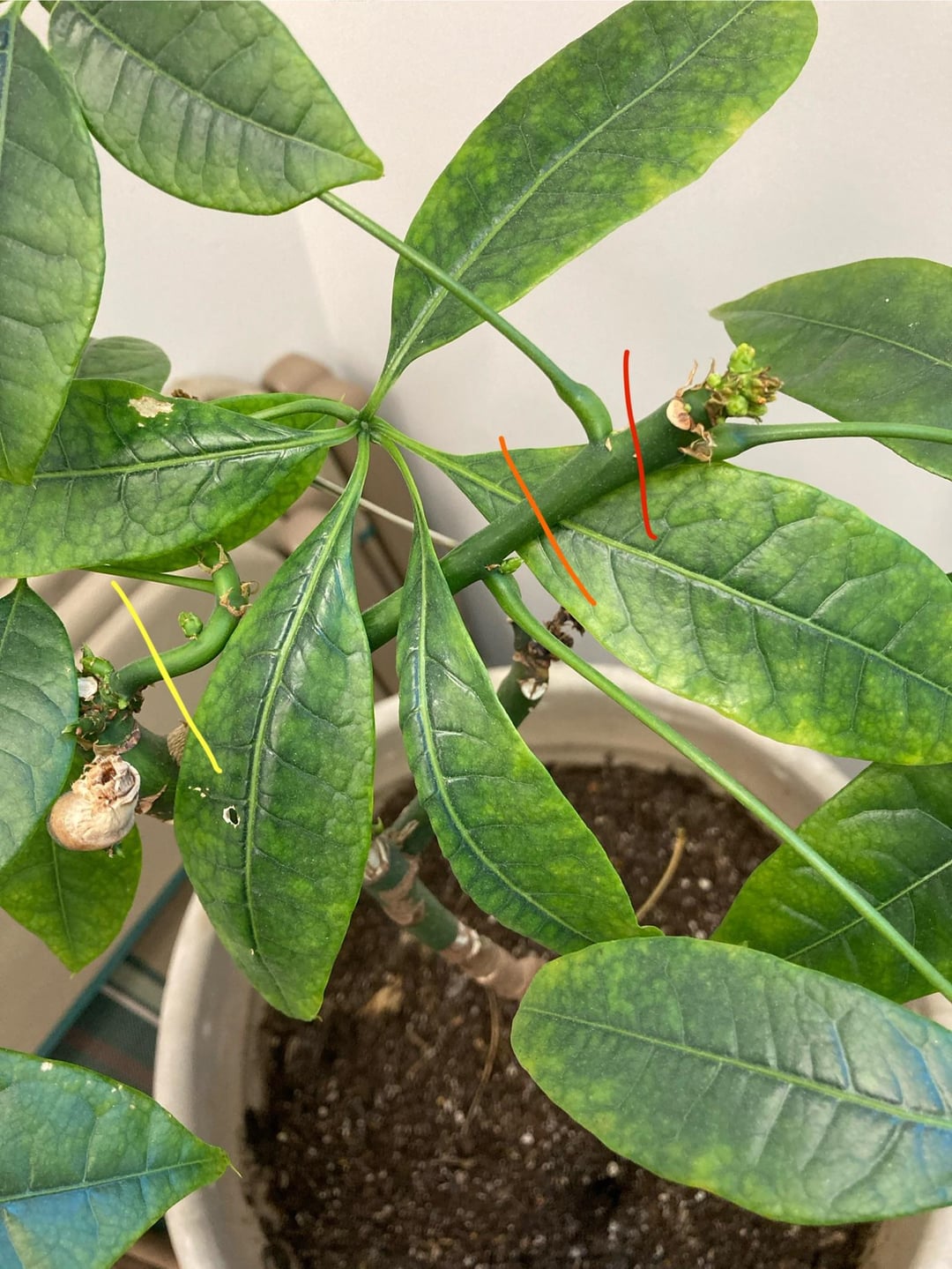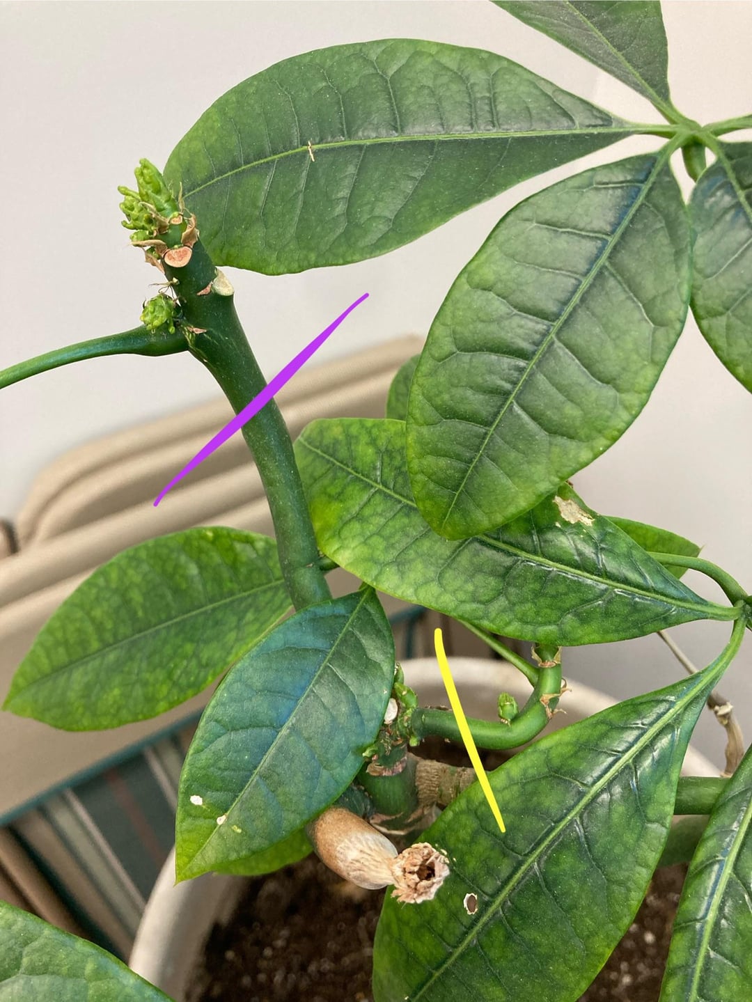 Wir haben diesen Schirmbaum im Einsatz und ich würde gerne einen Steckling als Stütze nehmen. Ich verstehe, dass es einen Knoten braucht, aber ich bin mir nicht sicher, was der beste Schnitt wäre. Ich habe meine Optionen farblich gekennzeichnet (die gelbe ist auf mehreren Bildern zu sehen). Sind einige davon realisierbar? Wofür würden Sie sich entscheiden?