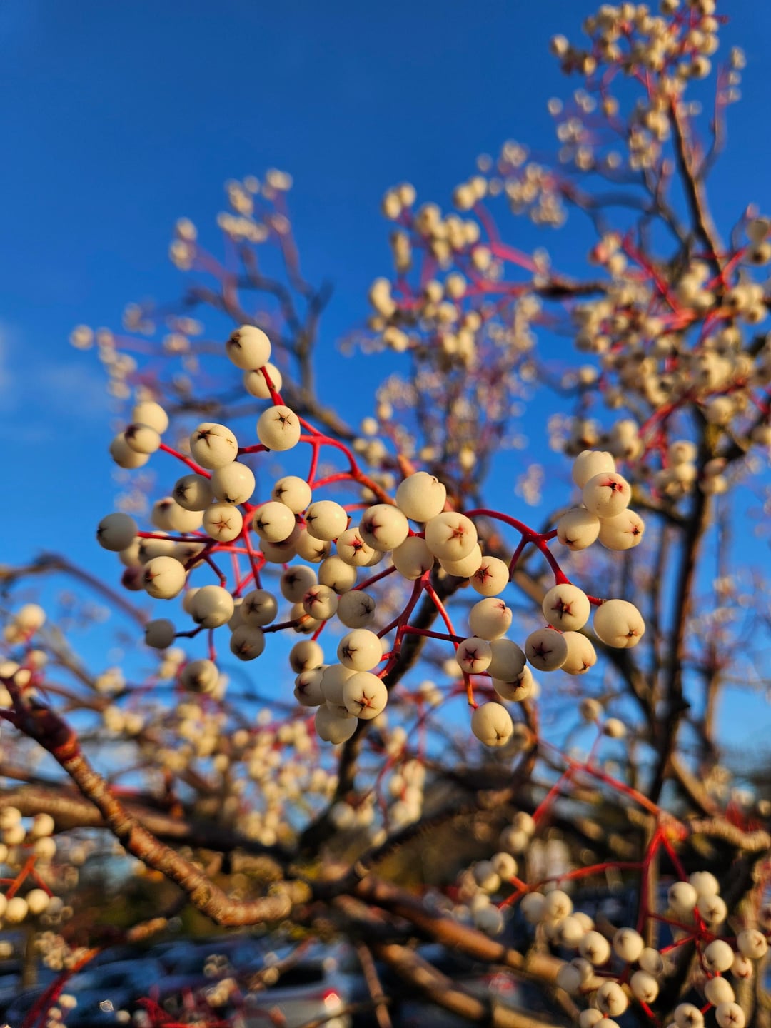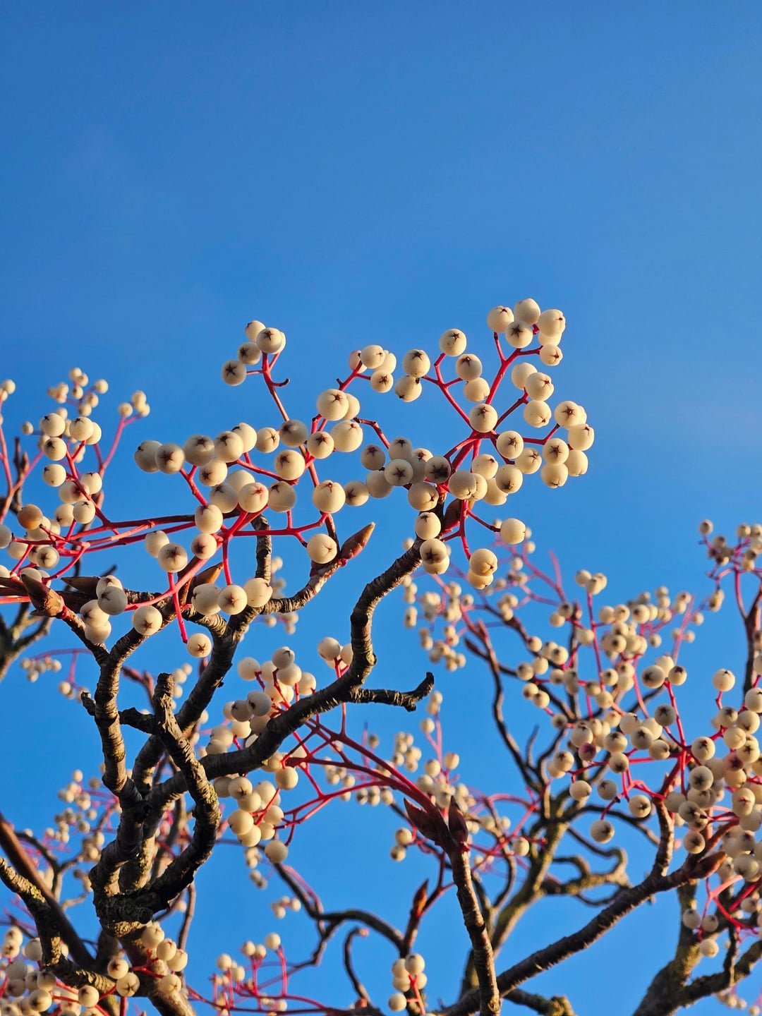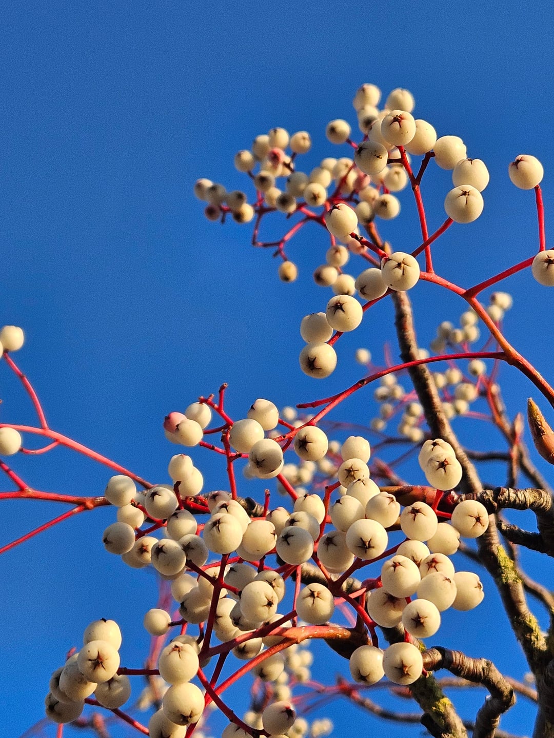 Interesting fact alert! Most UK birds aren’t used to eating white berries, as few native species have them (Mistletoe an honourable exception), so these berries often last a long way through the winter.