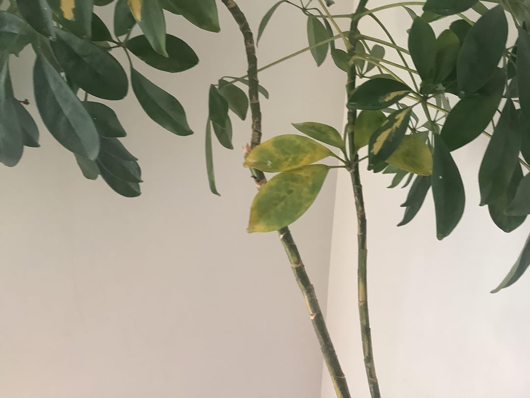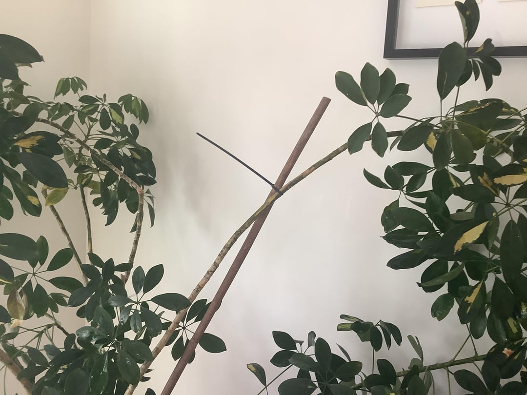 1 Wie beschneidet man diese Schefflera, um ihr Aussehen zu verbessern? Ich wünschte, es gäbe Blätter in der Mitte und nicht nur auf beiden Seiten.