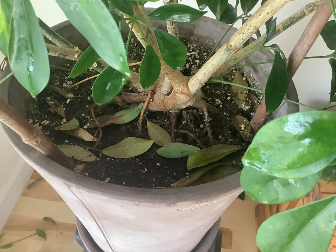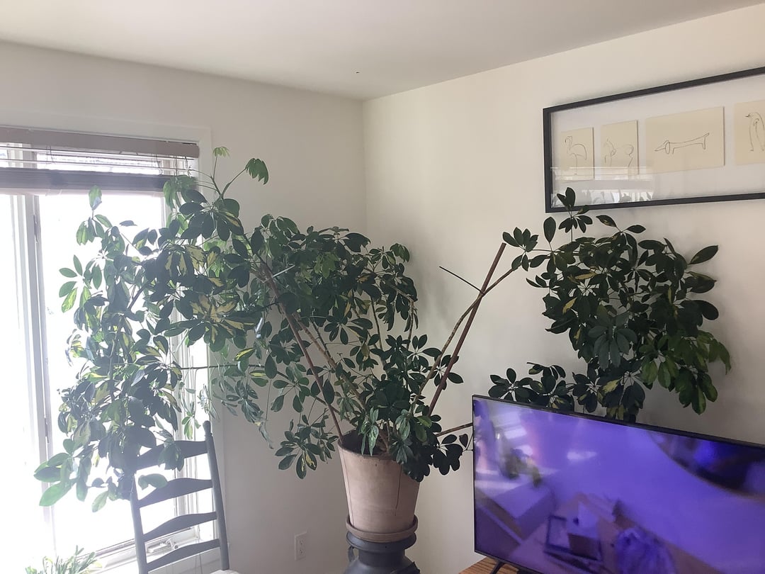 Meine Schefflera ist fast 30 Jahre alt. Allerdings hat es eine seltsame Angewohnheit und verliert diese Blätter. Es gibt viele lange, kahle Stängel