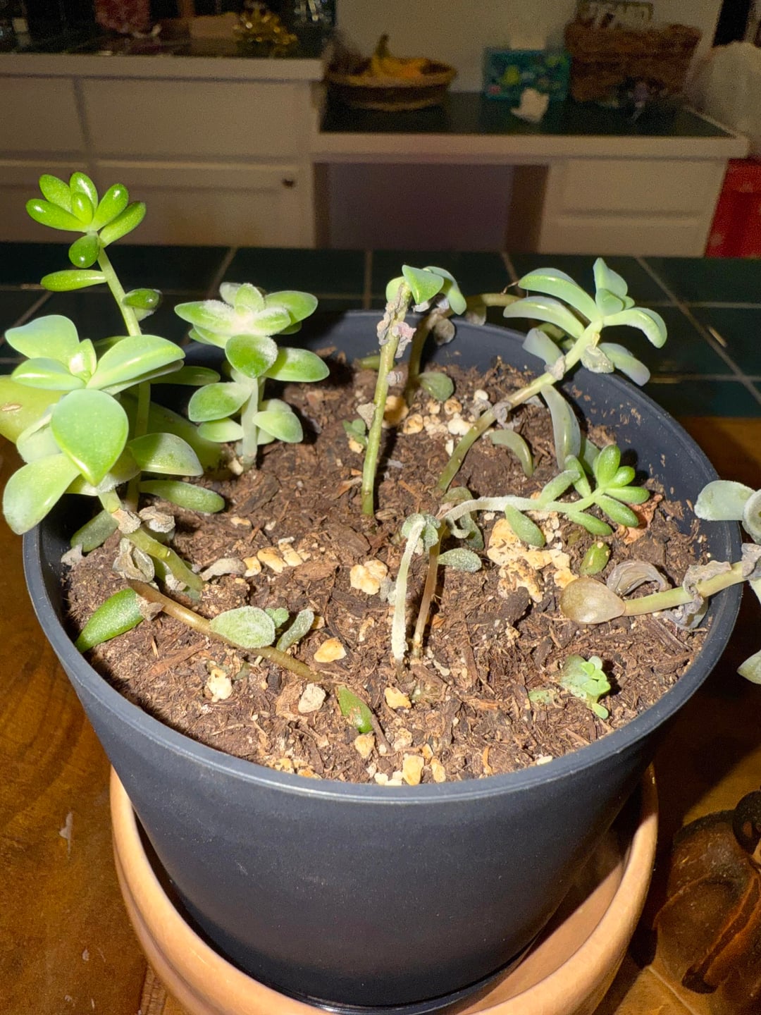 What’s your soil mix? It appears like general houseplant mix – correct me if I’m wrong. More ideal succ mix is thick, sandy, chunky, retaining little water and drying quickly. Terracotta pots are often used to aid drying.