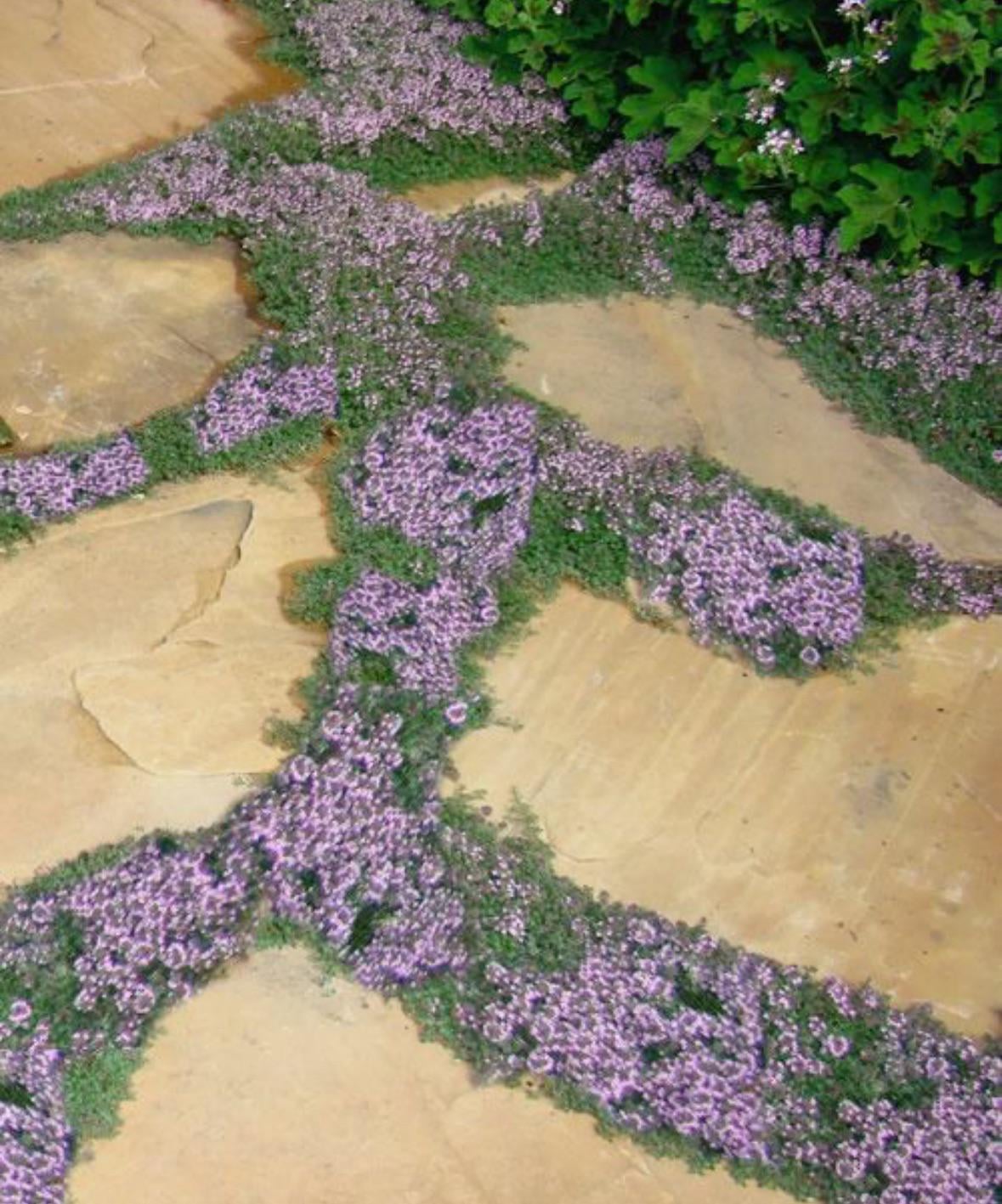 You can also get thymes with white flowers (including some variegation varieties), rather than pink, which can also be very effective – perhaps alternate the two in different clumps.