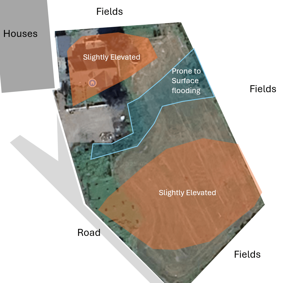 Das Land liegt auf niedrigem Niveau in Schottland. Der Boden ist sehr lehmhaltig und kann im Winter stark gesättigt sein. Ich bin mir nicht sicher, ob ich so etwas wie eine Feldentwässerung hinzufügen soll (falls ich das am Ende doch tue, muss ich möglicherweise eine Solarpumpe aufstellen, um Wasser vom tiefsten Punkt zu einem Bach auf der anderen Straßenseite zu fördern), aber ich würde gerne zuerst mehr natürliche Möglichkeiten erkunden.