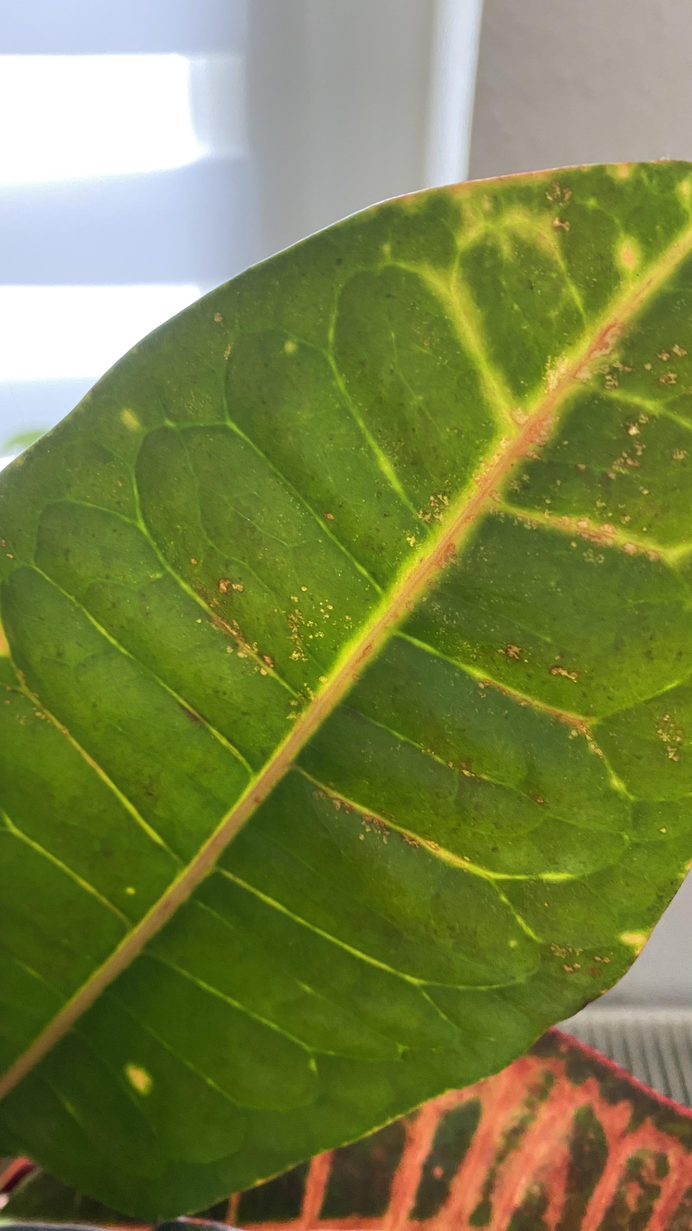 Ich bin mir nicht sicher, ob das eine normale Pigmentierung für den Croton ist, oder Thripse? Es ist nur auf einem Blatt so. Er hatte mal die weißen Viechern, aber nach dem Neemölkur sind sie weg