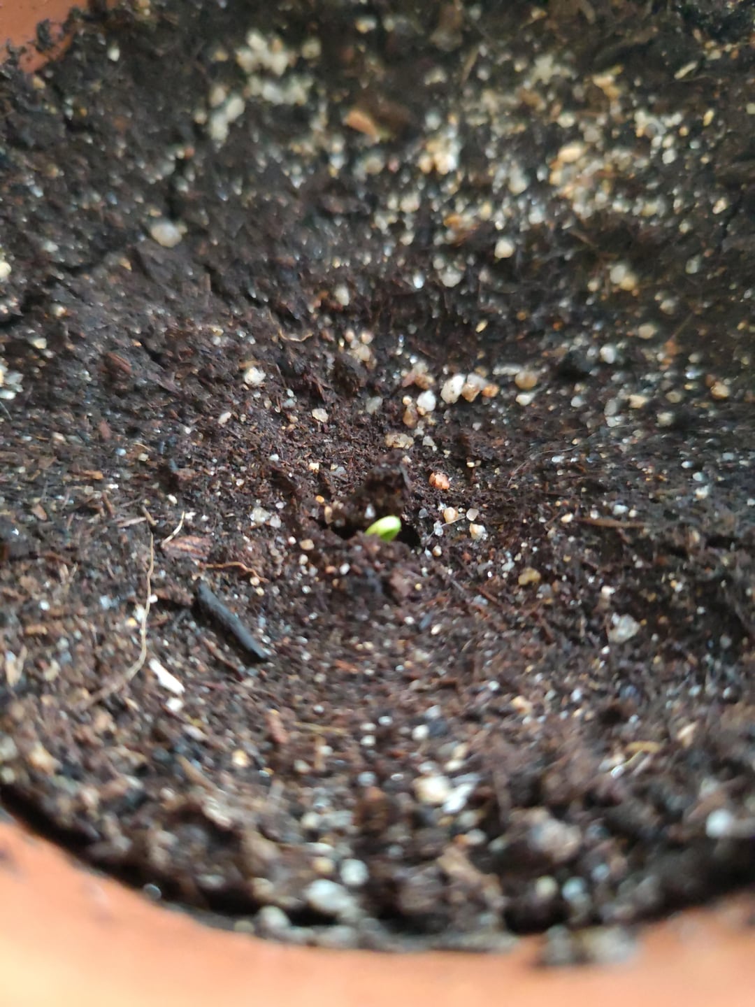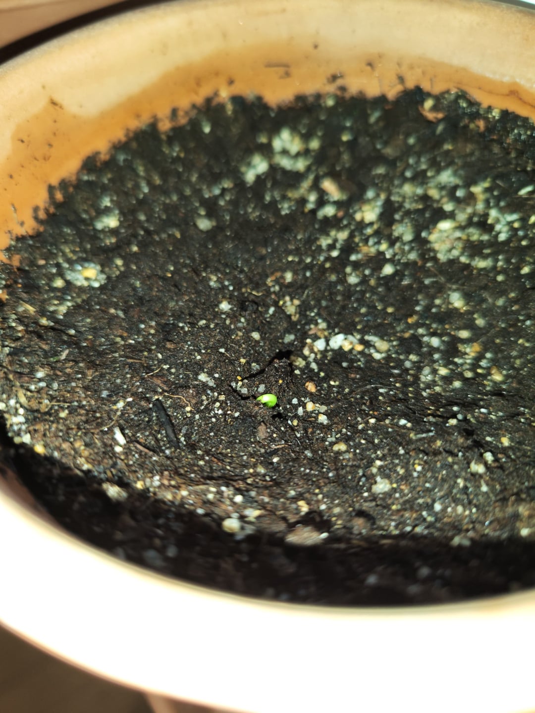 Mit großer Freude sah ich gestern Abend, als ich nach Hause kam, dass einer meiner Olivenkerne gekeimt war und aus dem Boden auftauchte!!