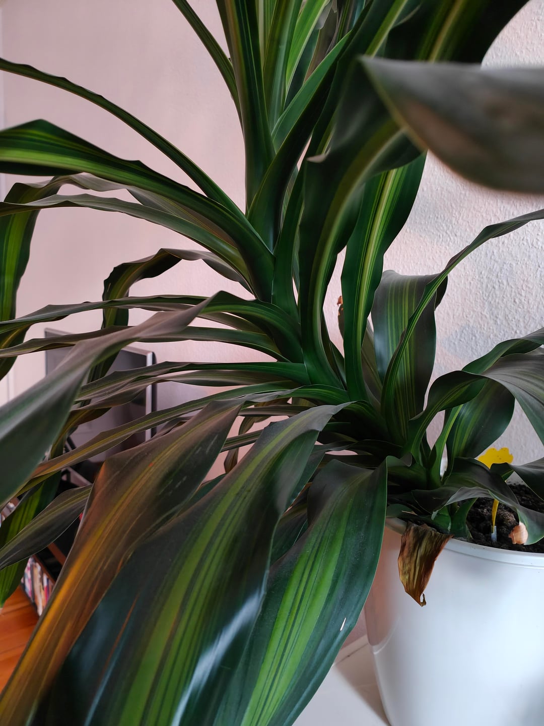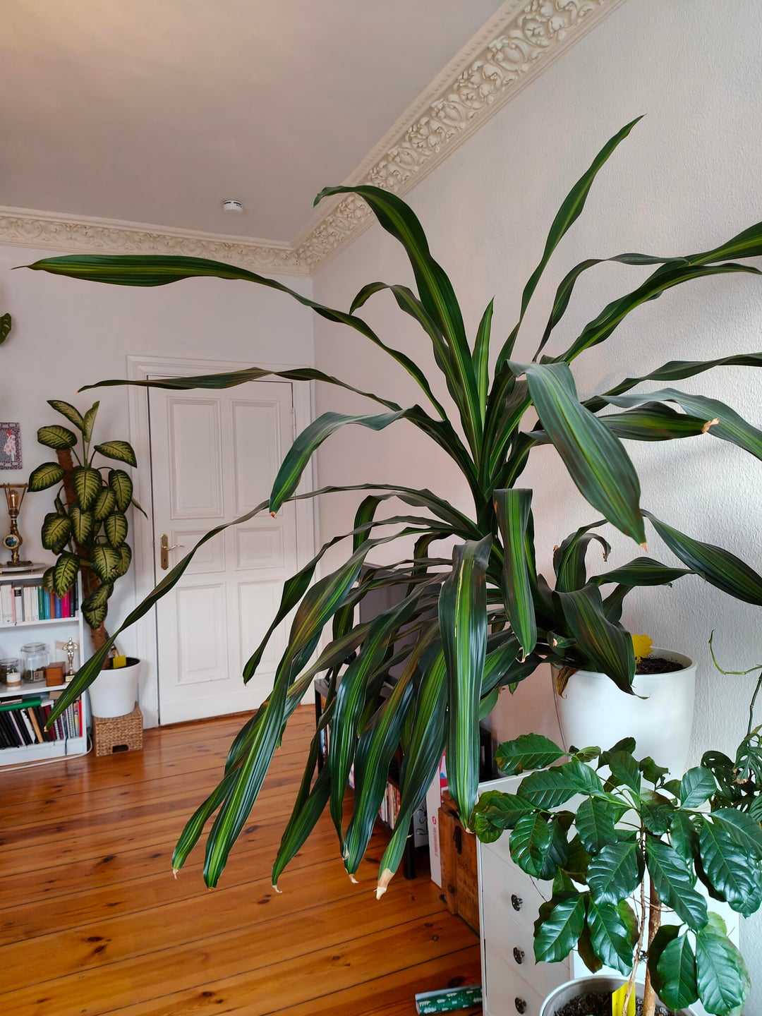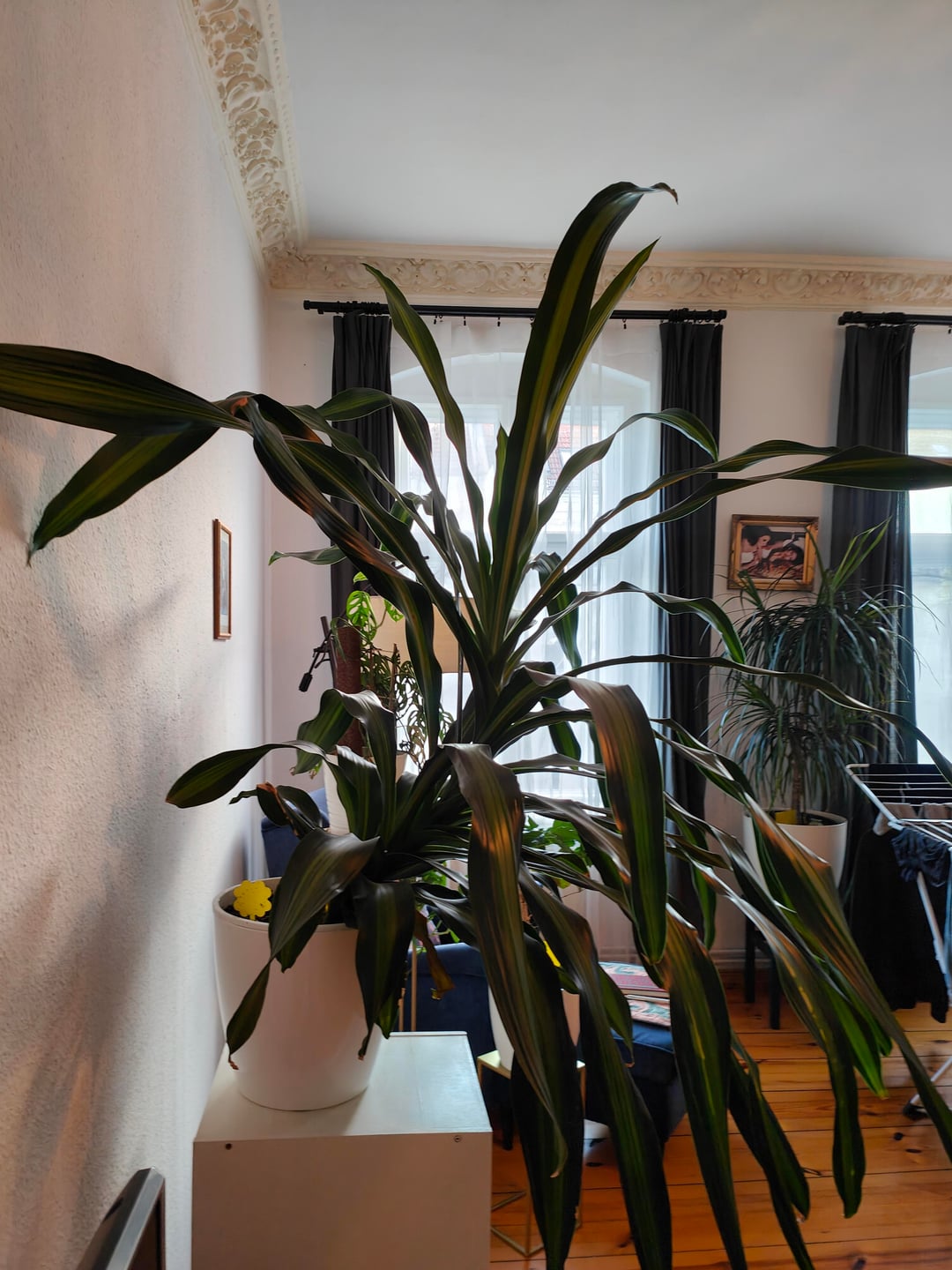 Hallo zusammen! Ich brauche dringend Hilfe mit meiner Pflanze, die wunderschön und munter vor sich hin wächst und inzwischen das halbe Wohnzimmer für sich beansprucht. Sie wächst immer mehr gekrümmt nach vorne (hoffentlich sieht man das in den Fotos). Inzwischen sieht der Stamm aus wie ein J. Ich habe Angst, dass sie kippt und möchte auch nicht, dass sie sich weiter horizontal ausbreitet. Ich habe überlegt, wie ich sie vielleicht an der Wand festmachen könnte ohne sie mit Schnüren oder Haken zu verletzen. Sie ist über 1,50 hoch und an der breitesten Stelle breiten sich die Blätter über 2m aus.