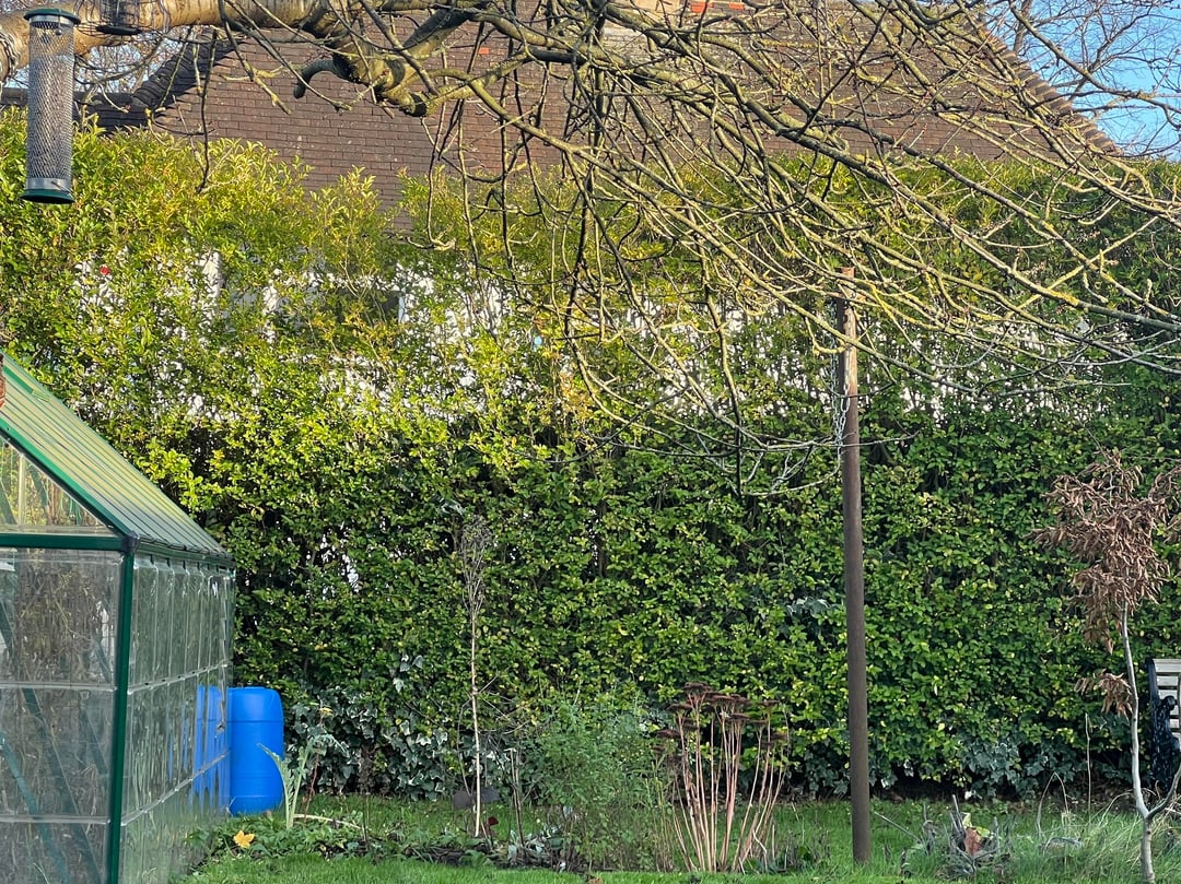 Es gibt jedoch einen Abschnitt der Hecke, der nicht sehr dicht und halbtransparent ist. Dies ist auch derselbe Abschnitt der Hecke, der früher mit einer Tiefe von mehr als 1,5 Metern tiefer war, aber der Nachbar hat ihn auf seiner Seite stark zurückgeschnitten, sodass die Hecke jetzt etwa 90 cm tief ist.