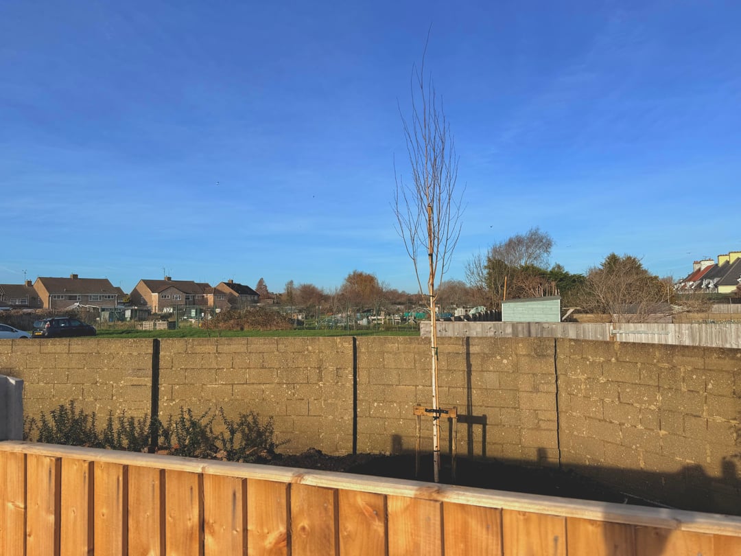 Die Birke wächst zur Vorderseite der Hecke hin, sodass der weiße Stamm etwas durch das Laub der Hecke sichtbar ist.