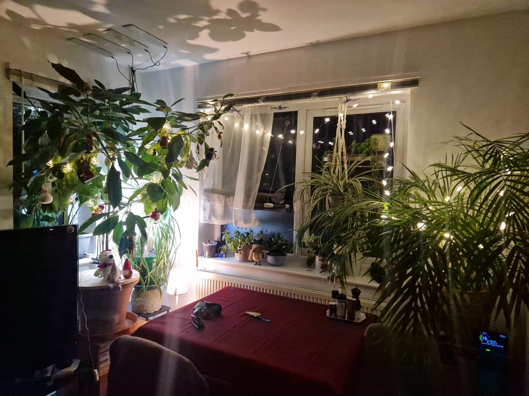Ich bin mir nicht sicher, ob er hierher gehört, aber das ist mein 8 Jahre alter Indoor-Avocadobaum. Er begann als Experiment und ist jetzt mein Weihnachtsbaum!