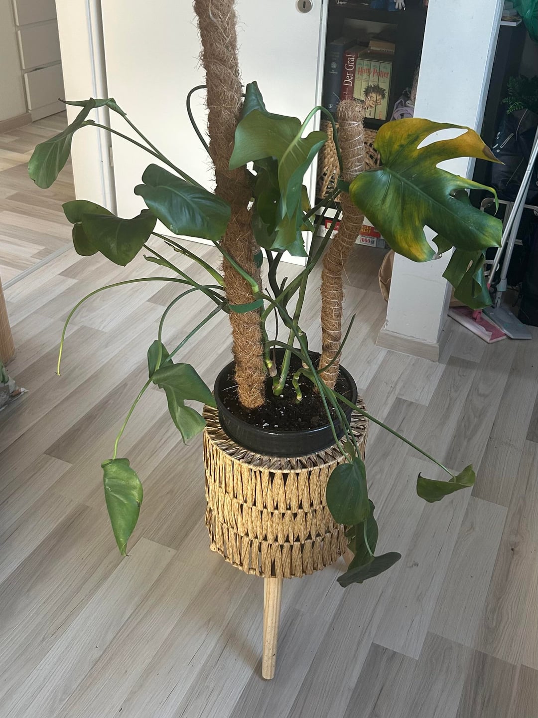Ich habe sie heute mit neuer Erde umgetopft (war wohl ursprünglich mal von Ikea und er vorherige Topf war winzig) und an ein paar Rankhilfen festgebunden, da schon viele Blätter einfach abgeknickt sind.