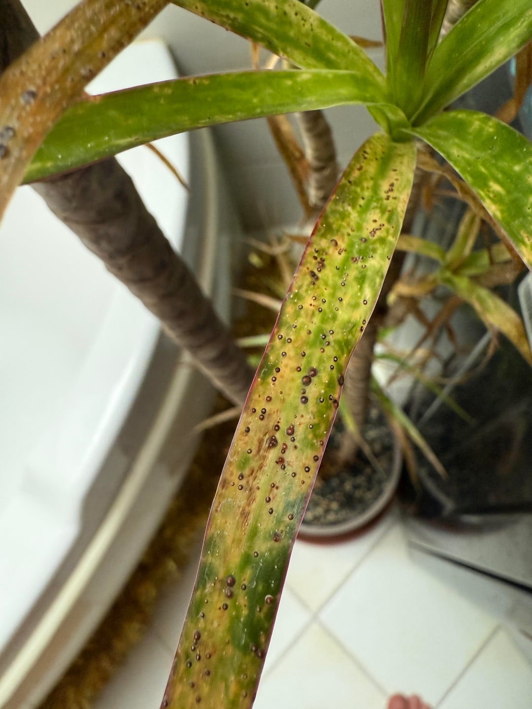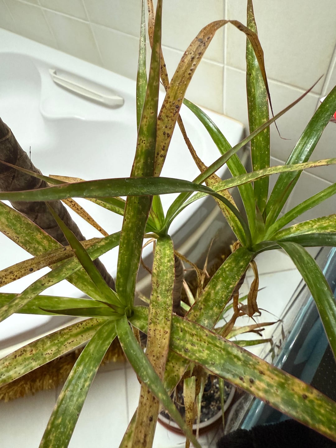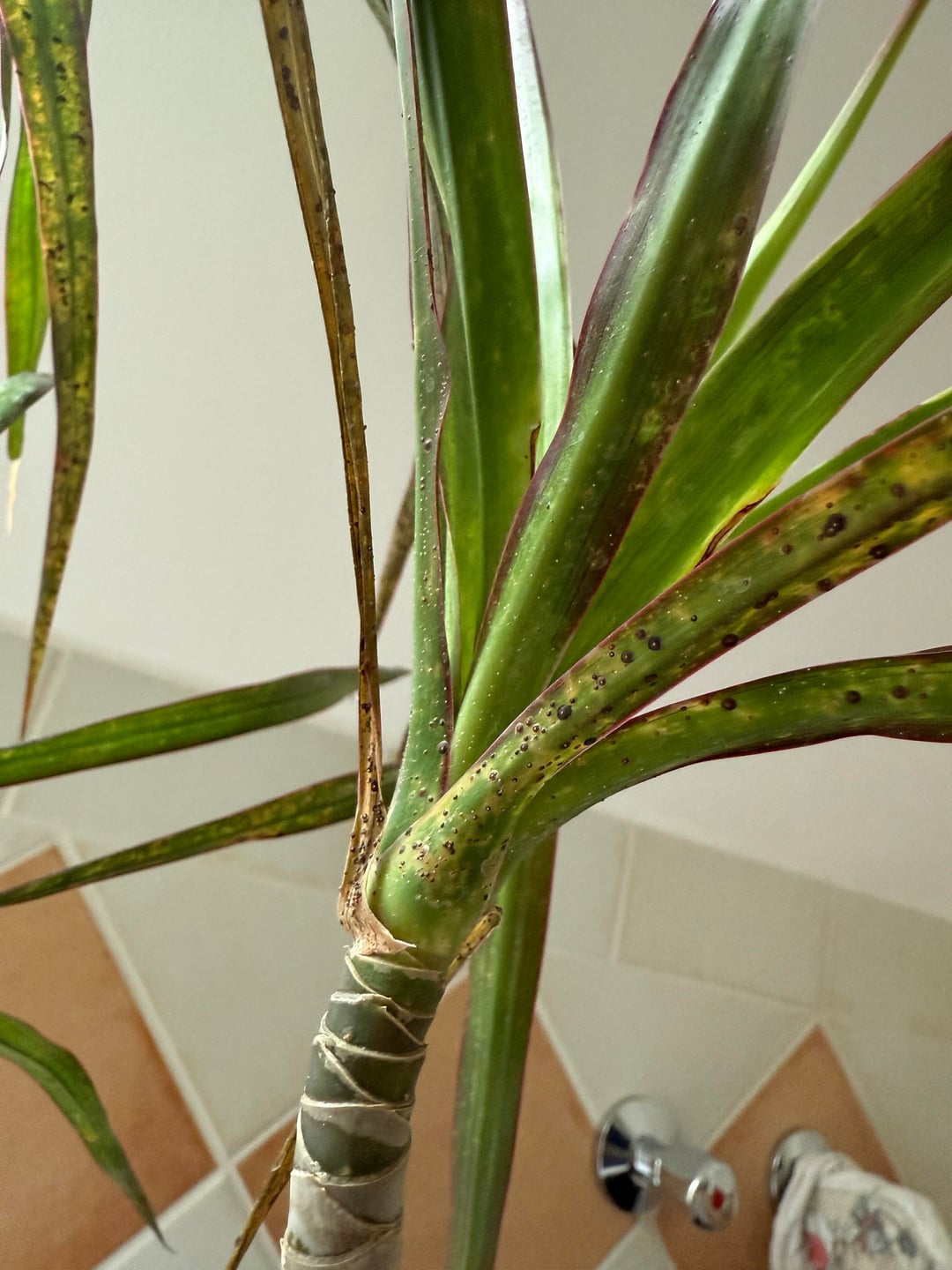 Vor einigen Monaten habe ich eine große Dracaena marginata im Angebot gekauft. Abgesehen von schlechtem Substrat und geringer Wasserpflege sah es gut aus. Als ich es mit nach Hause nahm, bekam es einen schönen umgetopften Badezimmerplatz mit normalem Tageslicht. Bald bemerkte ich diese seltsamen Punkte, aber die frischen Blätter waren immer gesund und stark. Ich habe so oft nachgesehen, aber ich sehe nie, dass etwas auf der Pflanze herumkrabbelt oder so, es sind nur diese Punkte, die ein bisschen wie Nährstoffverbrennungen durch zu viel Dünger aussehen.