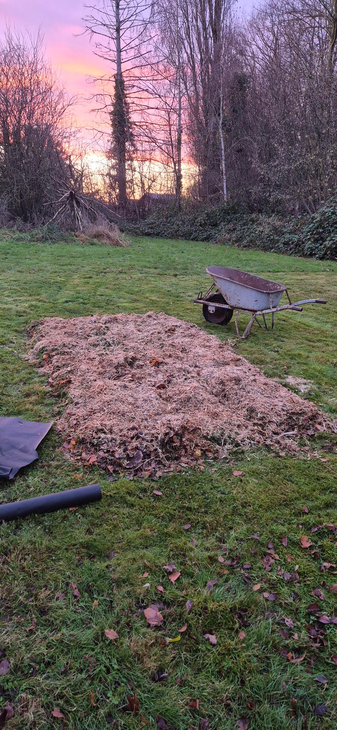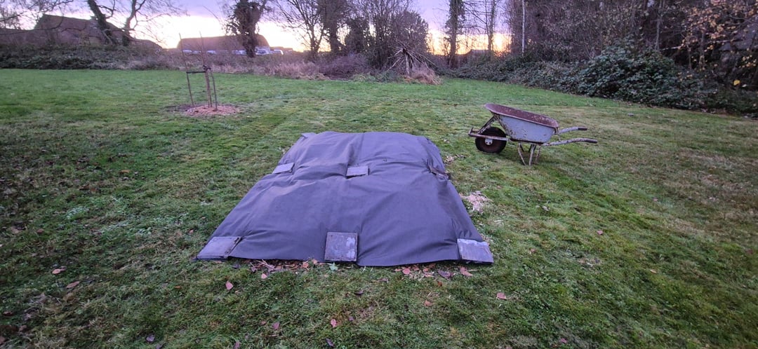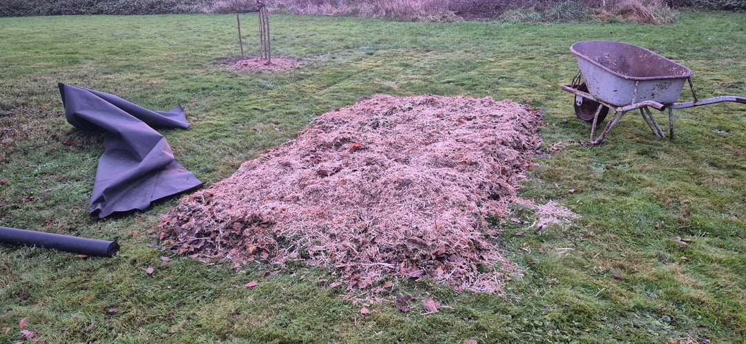 Soweit ich weiß, muss das Land im Voraus vorbereitet werden, was seit November geschieht. Ich lege eine Schicht Pappe darauf, dann eine Erde, die reich an verrottendem Holz ist, eine Schicht frisch geschnittenes Gras und einige Holzschnitzel. Die Tour ist mit einer Plane abgedeckt.