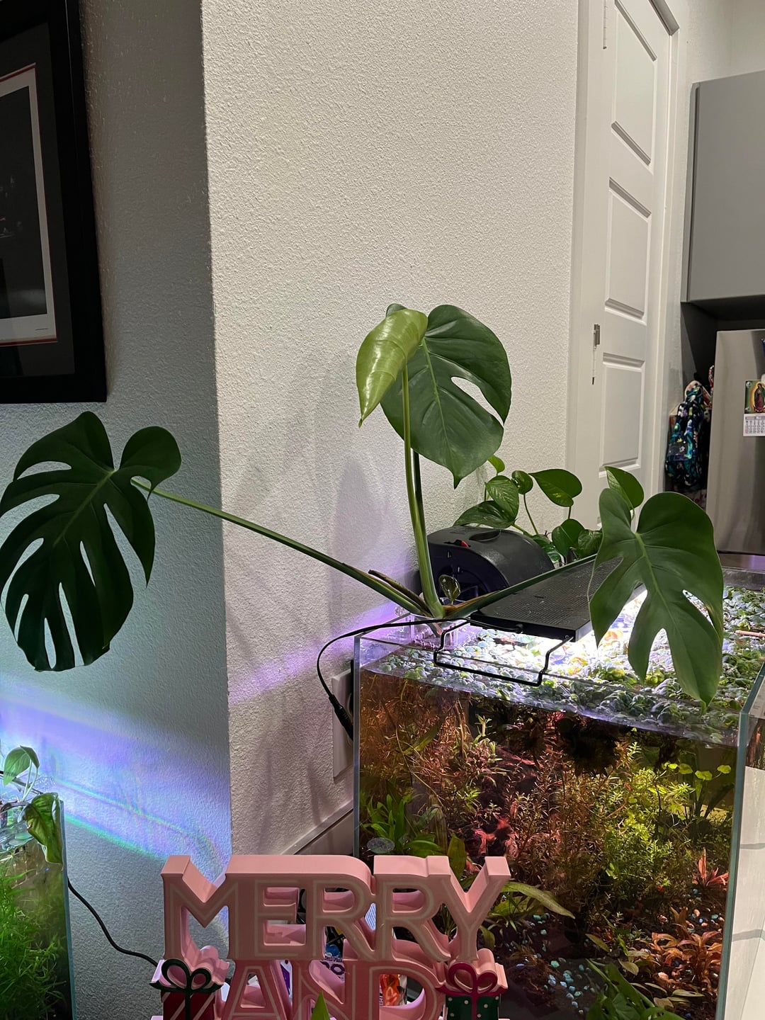 Offensichtlich kann ich bei meinen Monstera im Aquarium kein System anwenden. Diese Requisite hat bereits 3 Blätter hervorgebracht, die in meinem Aquarium auf diese Weise leben, und hat ein tolles Wurzelsystem, das bis zu meinem Substrat reicht. Das Entfernen würde den Wurzeln VIEL Schaden zufügen.