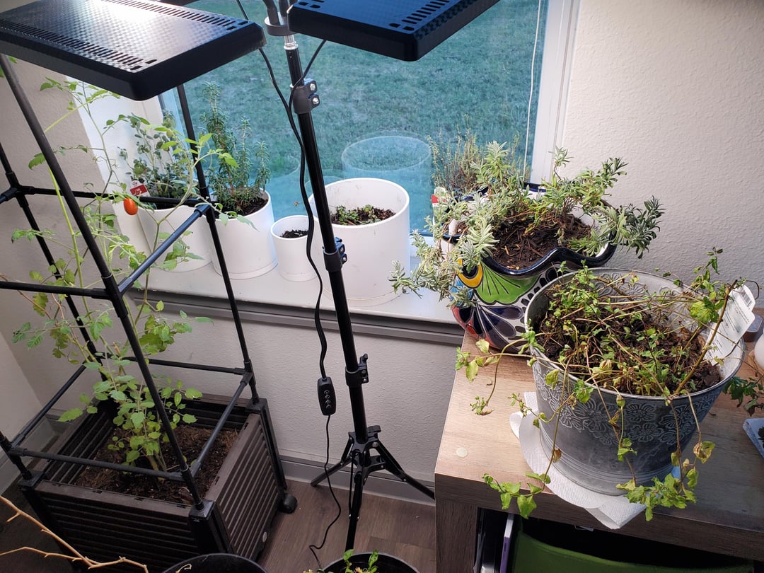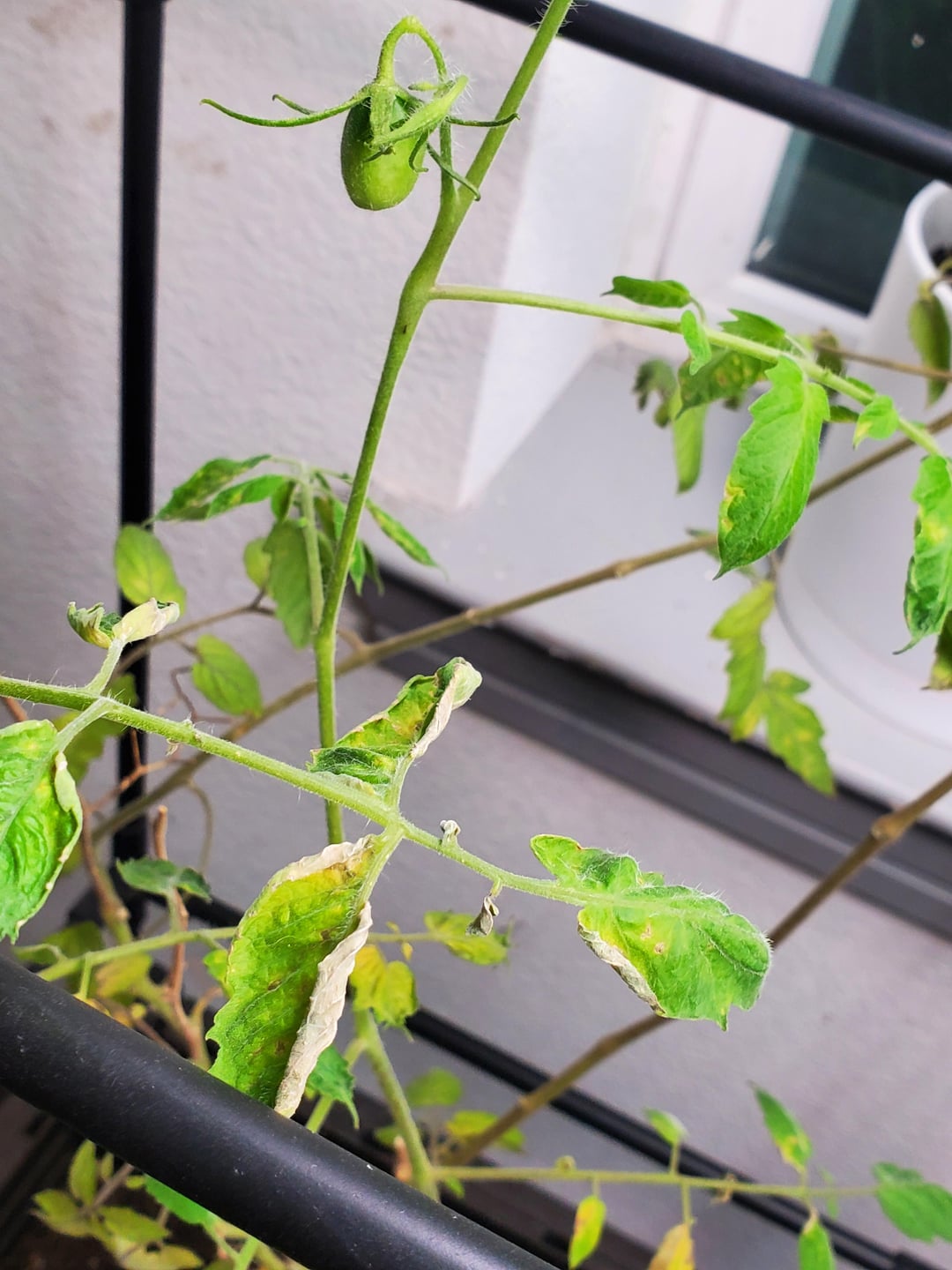 Die Blätter meiner Tomatenpflanze haben in den letzten zwei Wochen begonnen, sich auf diese Weise zu kräuseln. Ich bin mir nicht sicher, was los ist. Es ist seit etwa einem Monat drinnen, da sich das Wetter draußen ständig ändert (in Texas sind es an einem Tag 70, am nächsten unter 30). Es bringt immer noch neue Früchte hervor, wie Sie auf dem Bild sehen können. Auch die Gliedmaßen werden schwach, sie fallen häufig um. Ich habe mir auch drinnen eine Lampe besorgt und eine darüber und die anderen 2 über meine Kräuter gestellt.