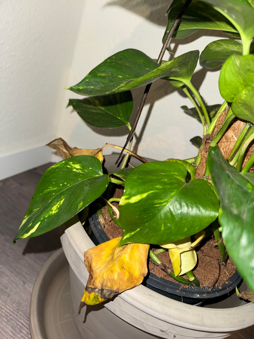 Dieses Verhalten ist sehr typisch für Epipremnum, sie sind super robust dagegen zu sterben, aber werfen ihr Laub ab, sobald ihnen etwas nicht passt. Keine Sorge – die Pflanze sieht weit weg von wirklich beschädigt aus. Auf den ersten Blick sieht das Substrat sehr trocken aus. Wirken die gesunden Blätter straff und gesund oder fühlen sie sich schlapp und weich an? Dann braucht sie dringend Wasser. Wenn das nicht der Fall ist und die Blätter fest sind, das Substrat lange nass bleibt, dann könnte sie auch übergossen sein und Fäule haben – dazu müsstest du sie einmal aus dem Topf heben und die Wurzeln anschauen. Generell halte ich das aber eher für unwahrscheinlich, weil sich das eher an dunklen Flecken und knusprigen Rändern abzeichnet. Generell ist der Winter eine harte Zeit für tropische Pflanzen, sie sind daran nicht angepasst und bekommen plötzlich deutlich weniger Licht (außer man verwendet Kunstlicht), sowie trockene Heizungsluft und eventuell kalte Zugluft. Dann gibt es noch die Düngerfrage, im Winter das Wachstum durch die oben genannten Gründe start reduziert. Deshalb brauchen sie dann auch fast keinen Dünger (außer man verwendet Kunstlicht).