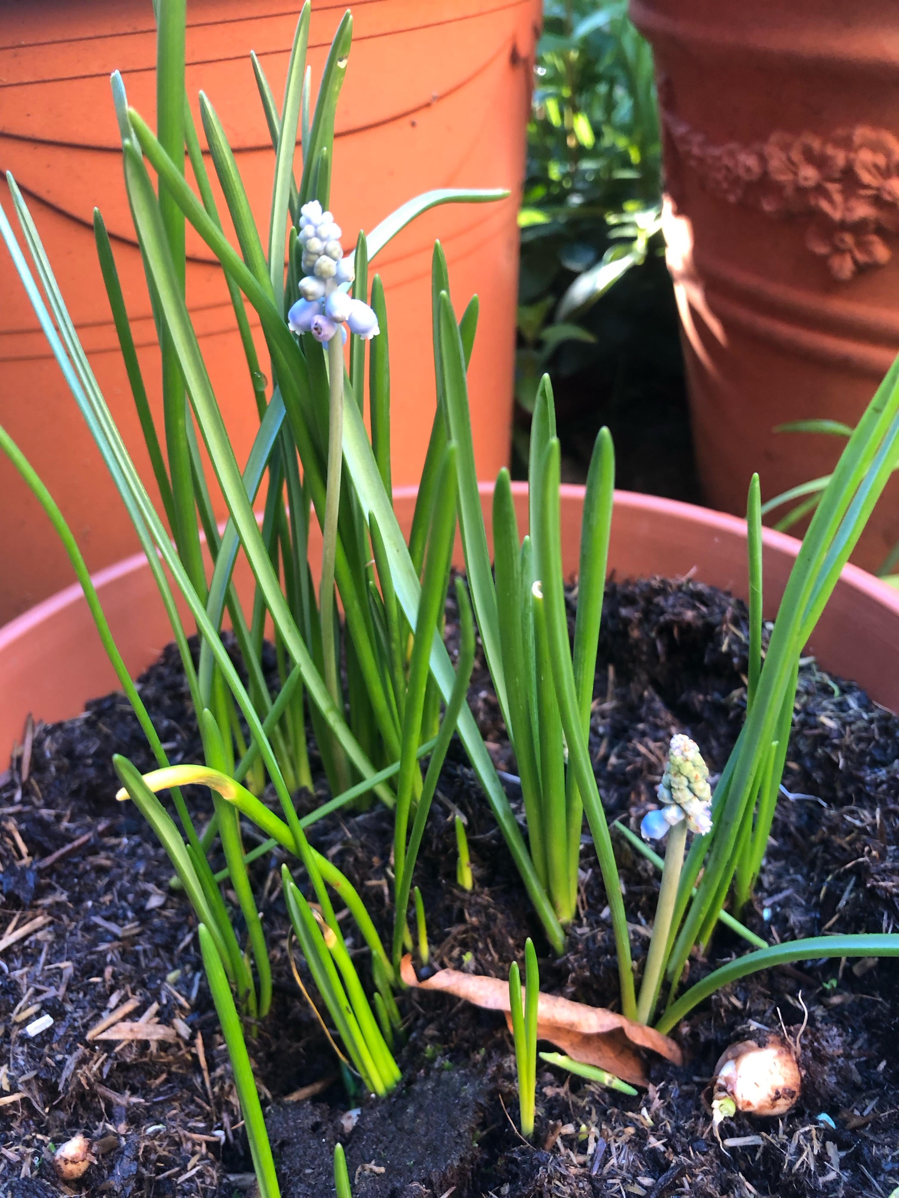 Das sind alte Blumenzwiebeln, die ich letztes Jahr in einem Topf aufbewahrt habe, und sie sind von dem warmen Dezember, den wir hatten, genauso verwirrt wie ich!