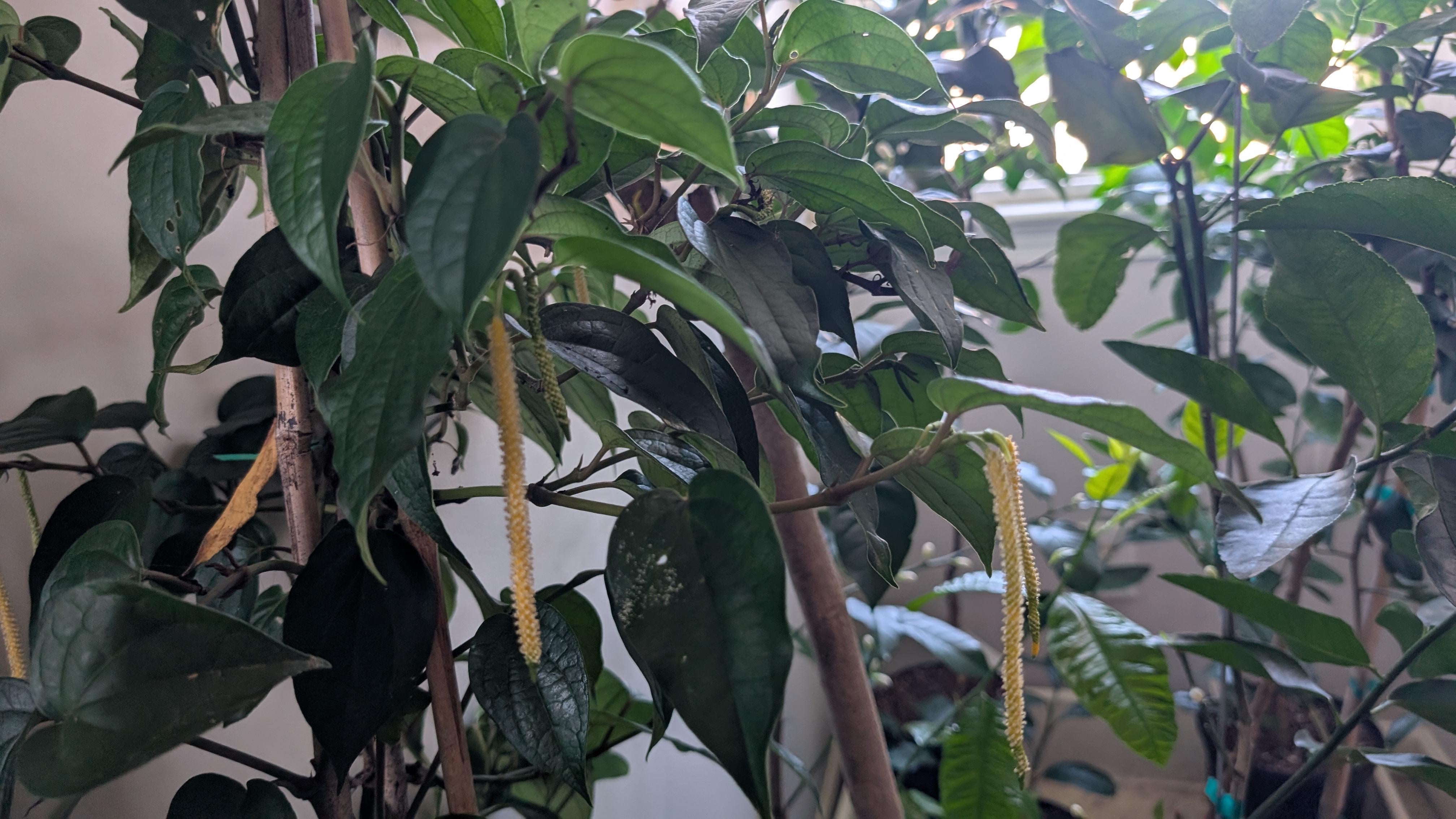 Ich habe diese schwarze Pfefferpflanze seit Jahren. Die Knospen sind immer gewachsen, aber ich habe selten erlebt, dass sie Pollen abgeworfen haben, und schon gar nicht in dieser Menge. Ich habe gehört, dass es noch lange dauern kann, bis es überhaupt Früchte trägt.