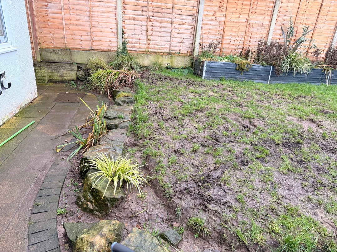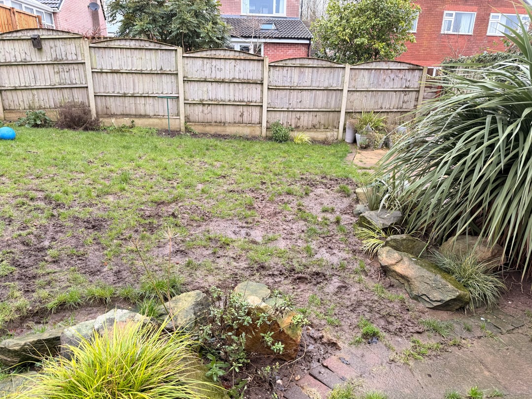 Wie Sie auf den Fotos sehen können, gibt es in meinem Garten ein großes Entwässerungsproblem, das jeden Winter das Gras zerstört. Wir haben das Gras jetzt im Frühjahr zweimal neu gesät und es wächst gut, obwohl es in der Nähe der Palmenpflanze sehr fleckig ist und das schon immer war. Wir haben auch zwei große Hunde, was nicht hilft.