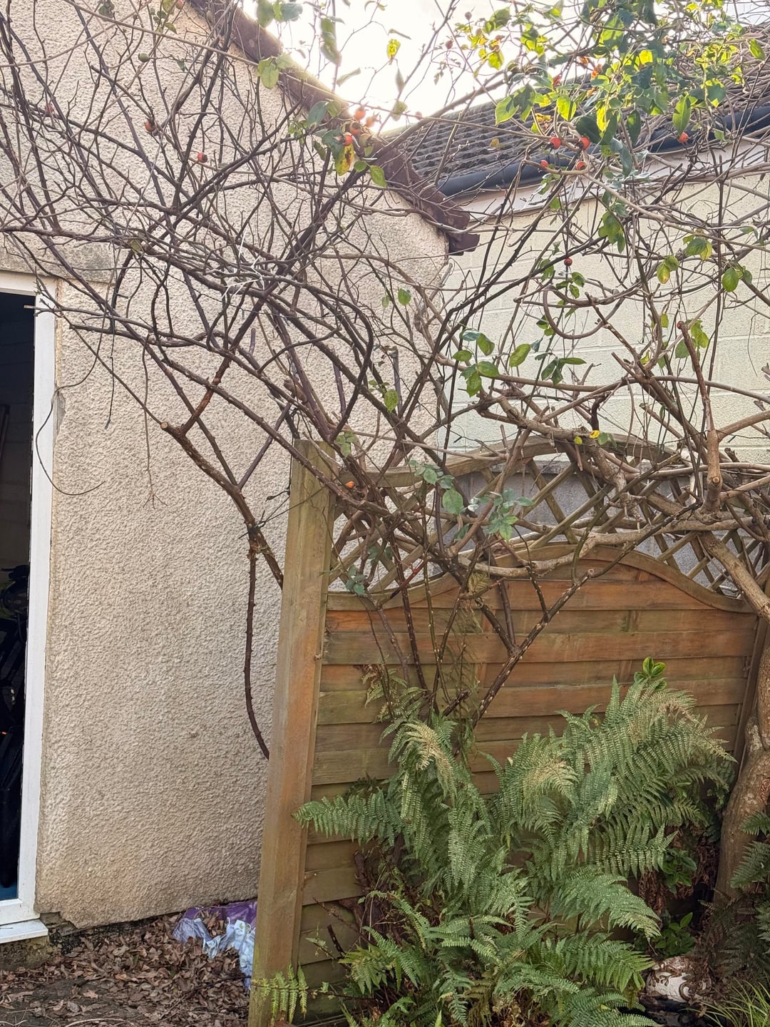 Es steht auch neben diesem Rosenstrauch, der von Glyzinien umhüllt ist. Sollte ich ihn ganz zurückschneiden?