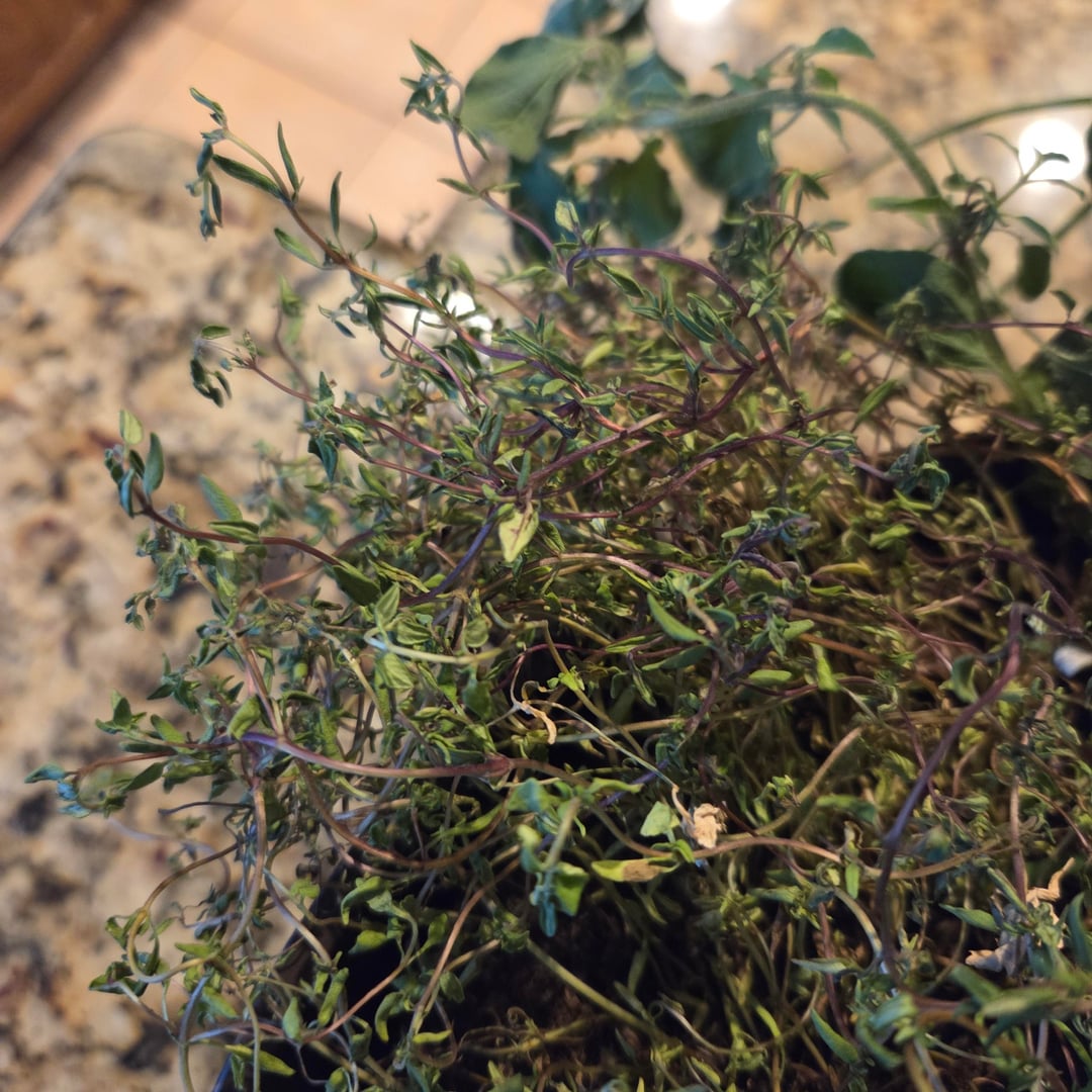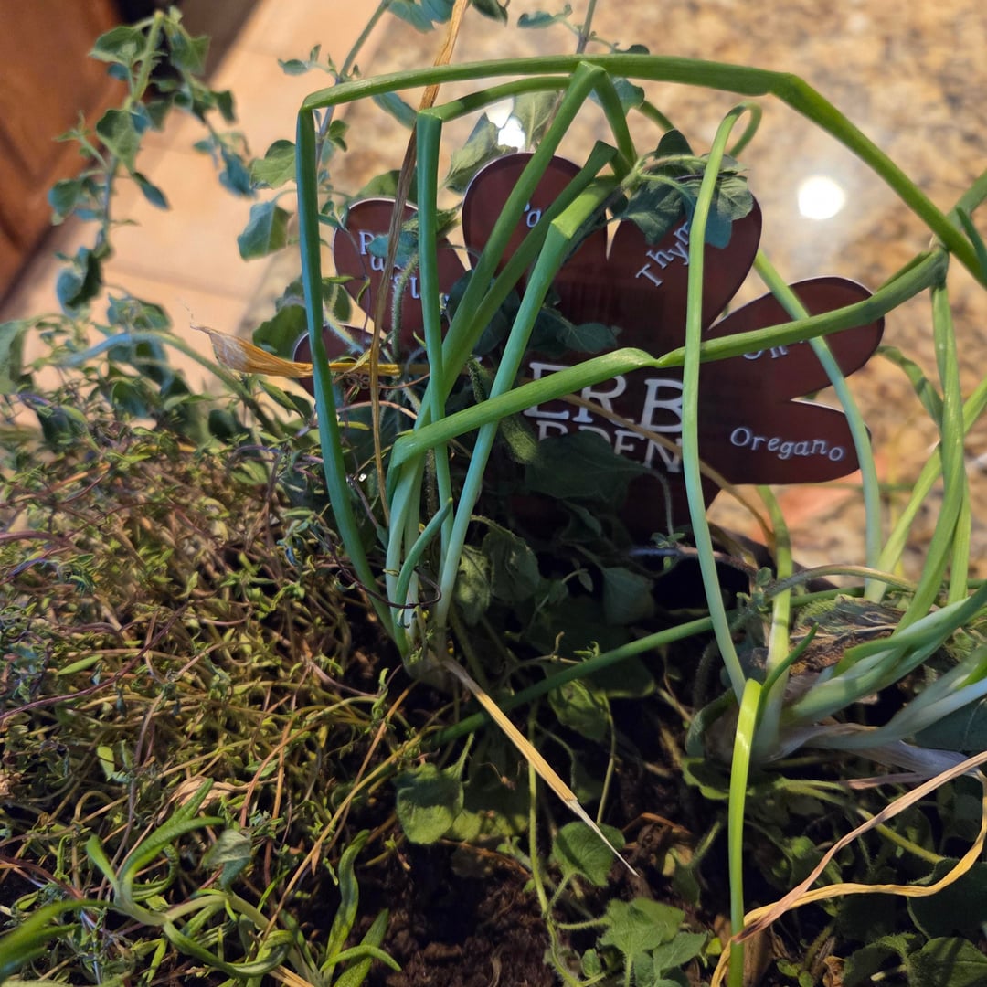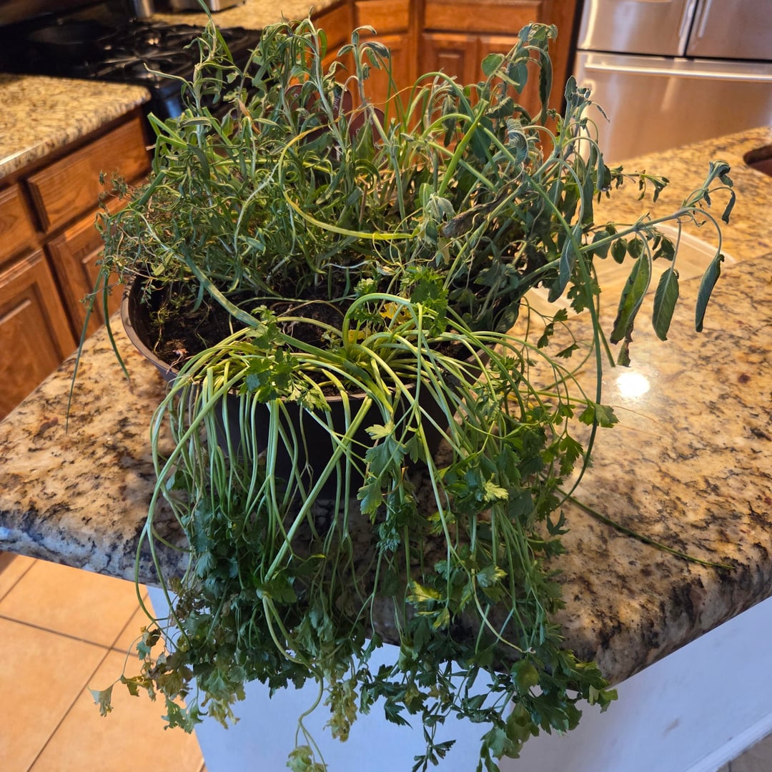Ich habe diesen Topf mit Kräutern von einem Freund geschenkt bekommen, der sie offensichtlich vernachlässigt hat. Bis auf die Petersilie ist alles mehrjährig: Rosmarin, Salbei, Thymian, Schnittlauch und Oregano. Ich wollte schon immer einen Kräutergarten haben, bin aber nie dazu gekommen. Da ich nicht mit Samen beginne und sie in eine neue Umgebung gebracht wurden, bin ich mir nicht sicher, was genau ich tun soll.