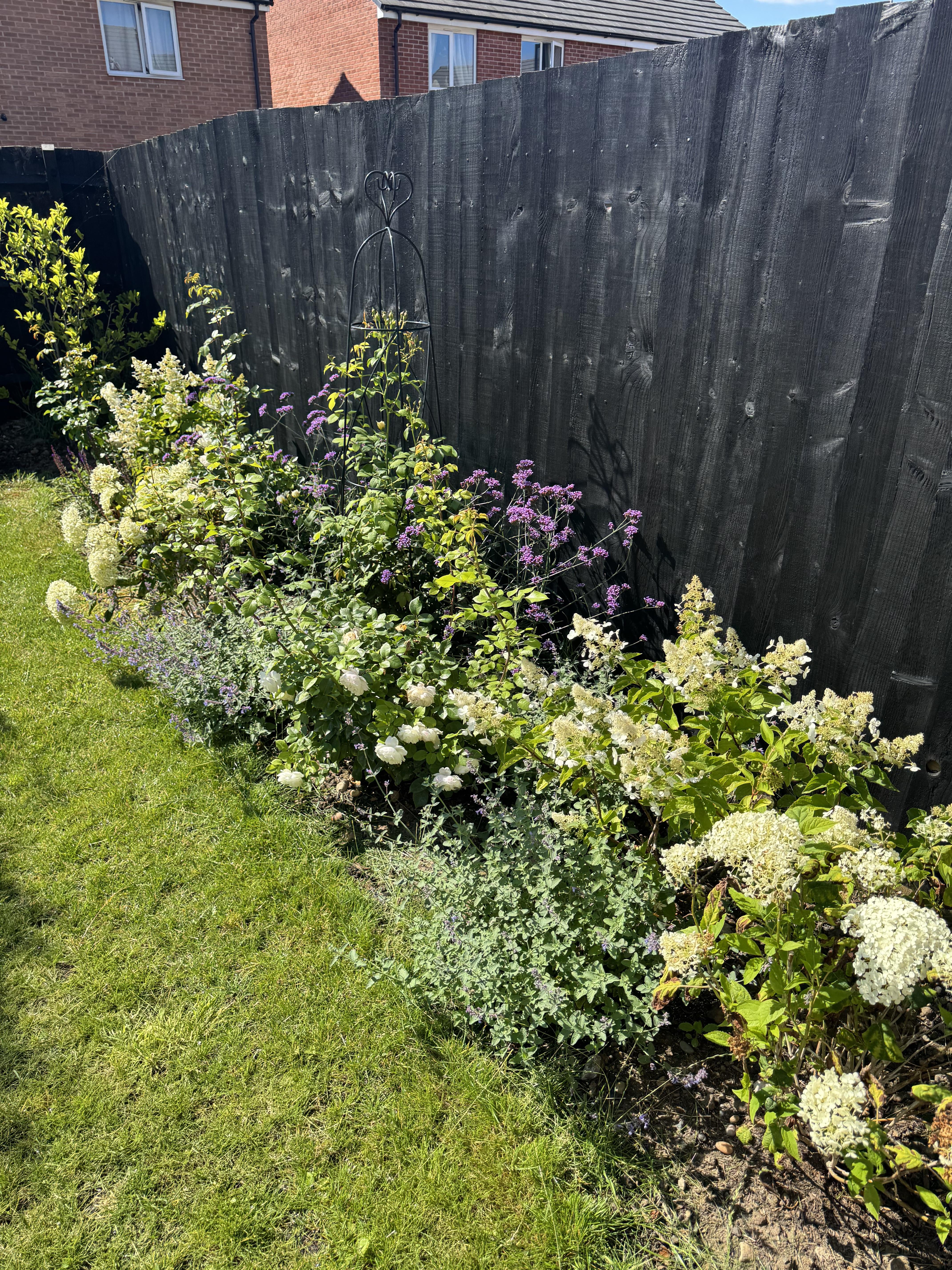 Dieses Jahr begann ich mit einem leeren Rand und verwandelte ihn in das, was Sie oben sehen (weißes und violettes Thema), mit Rosen, Hortensien, Eisenkraut, Katzenminze und Salbei.