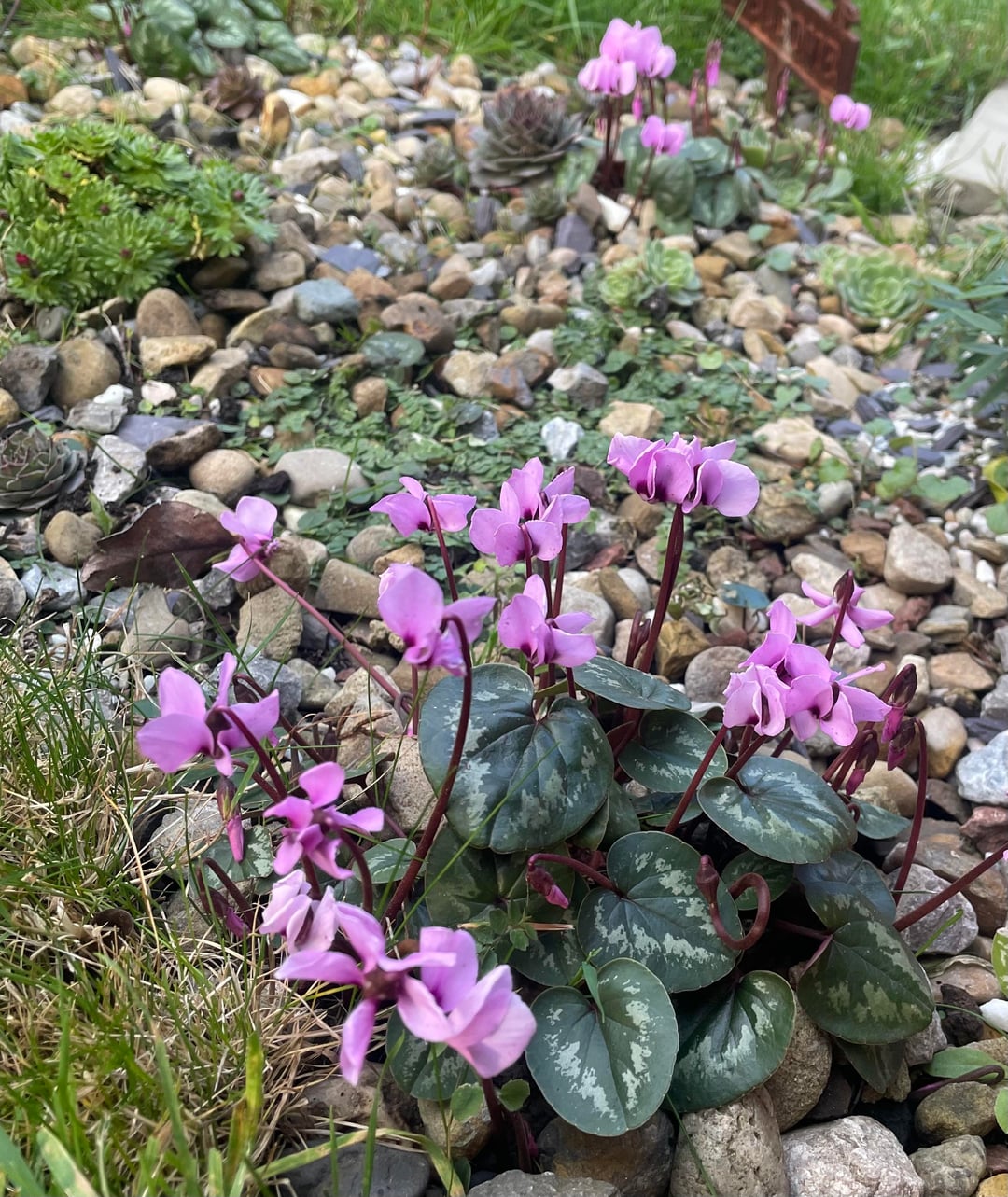 Die Alpenveilchen und Alpenveilchen, die ich in den letzten Jahren gepflanzt habe, sprießen überall in meinem Garten – herrlich zu dieser Jahreszeit. Von: iklegemma