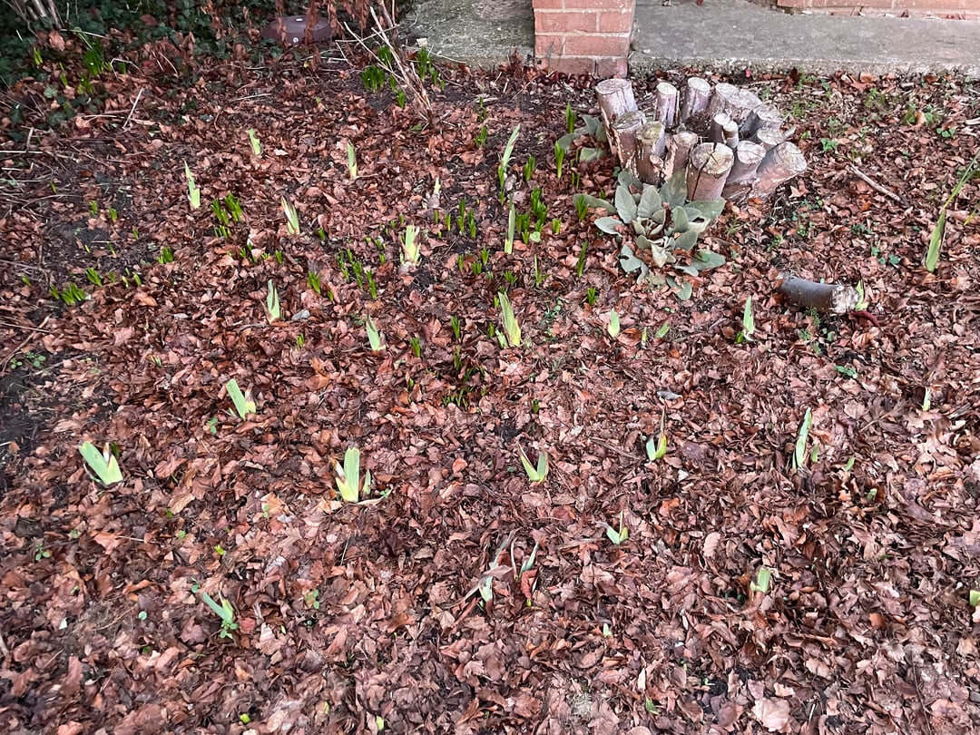 Ich habe die obersten Zentimeter des Unkrauts entfernt und dort, wo ich sie gefunden habe, die Glockenblumenzwiebeln ausgegraben. Anschließend pflanzte ich Iris-Rhizome und bedeckte sie für den Winter mit Mulch.
