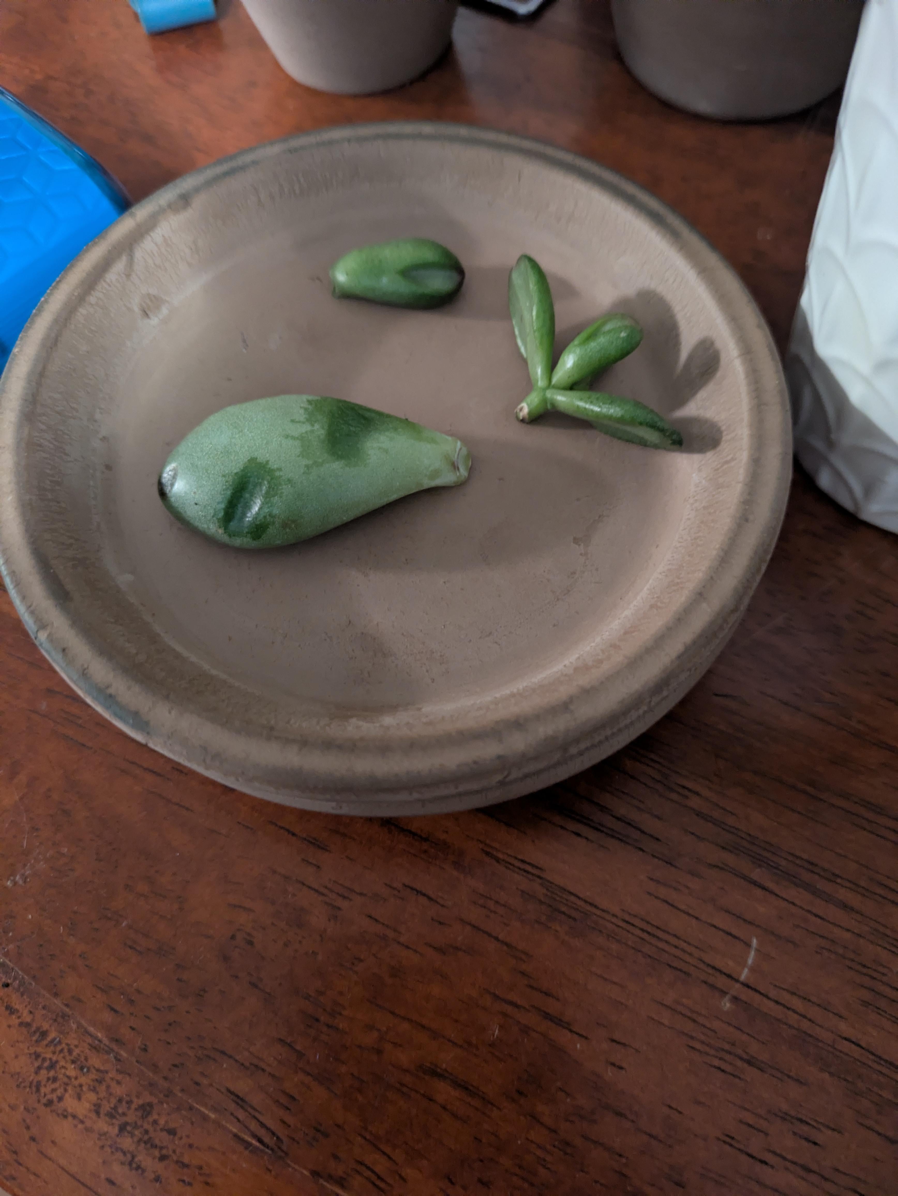 Zum ersten Mal gepostet! Ich bin gespannt, ob sich aus meinen kleinen Fundstücken eines Tages eine volle Pflanze entwickeln wird! Es handelt sich um Hobbit-Jade, und ich bin mir bei dem großen, dicken Blatt nicht ganz sicher. Ich habe vergessen, die ganzen Pflanzen zu fotografieren. Arme Dinge brauchen viel mehr Licht, als sie bekommen. Super langbeinig. Warum ich nicht den vollen Preis dafür ausgeben konnte, sonst hätte ich mir eines geholt. Ich werde die Augen offen halten und sehen, ob sie etwas notieren. Denn es würde mir nichts ausmachen, einen zum Hacken und Stützen zu haben.
