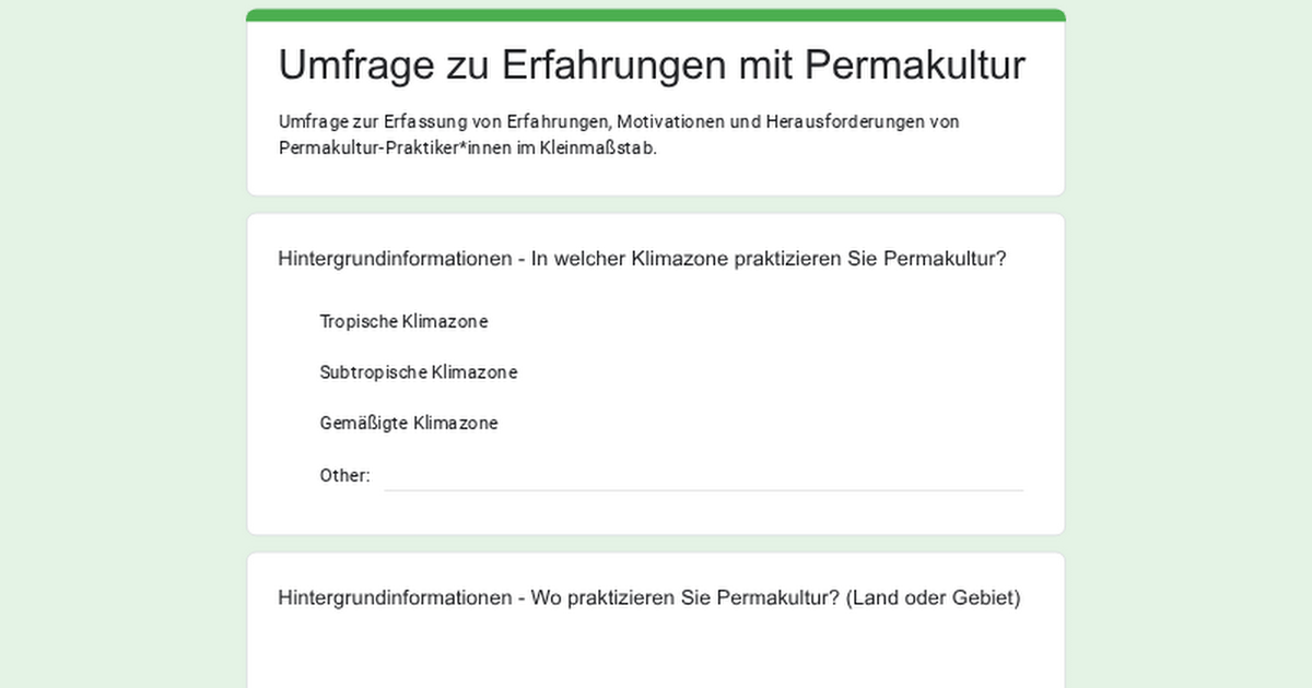 Ich versuche herauszufinden, warum das Konzept der Permakultur noch nicht in großem Maßstab angewendet wird und was Pionier*innen bei der Umsetzung bereits erlebt haben. Dazu habe ich eine kurze Umfrage erstellt, um die Herausforderungen besser zu verstehen.