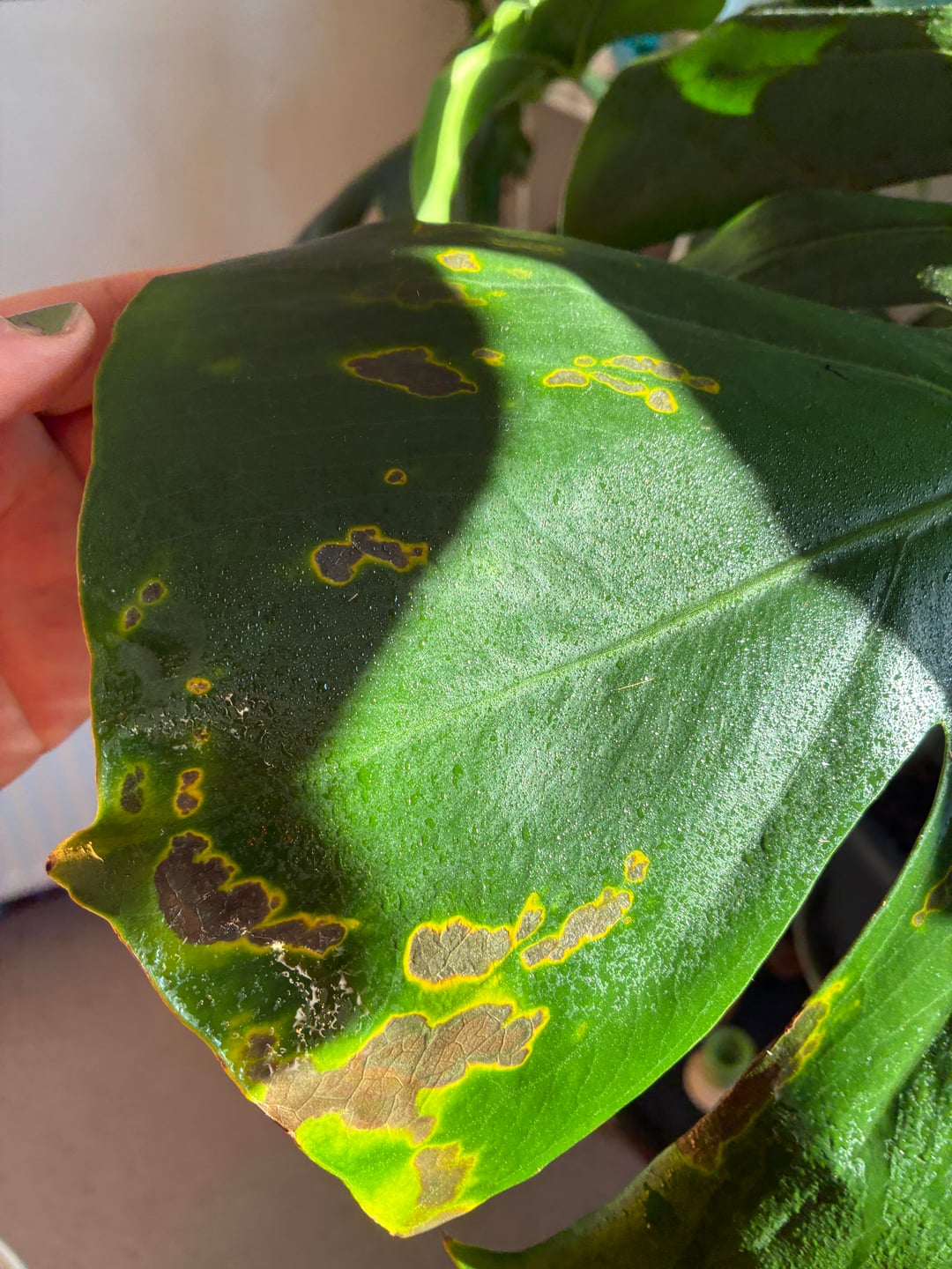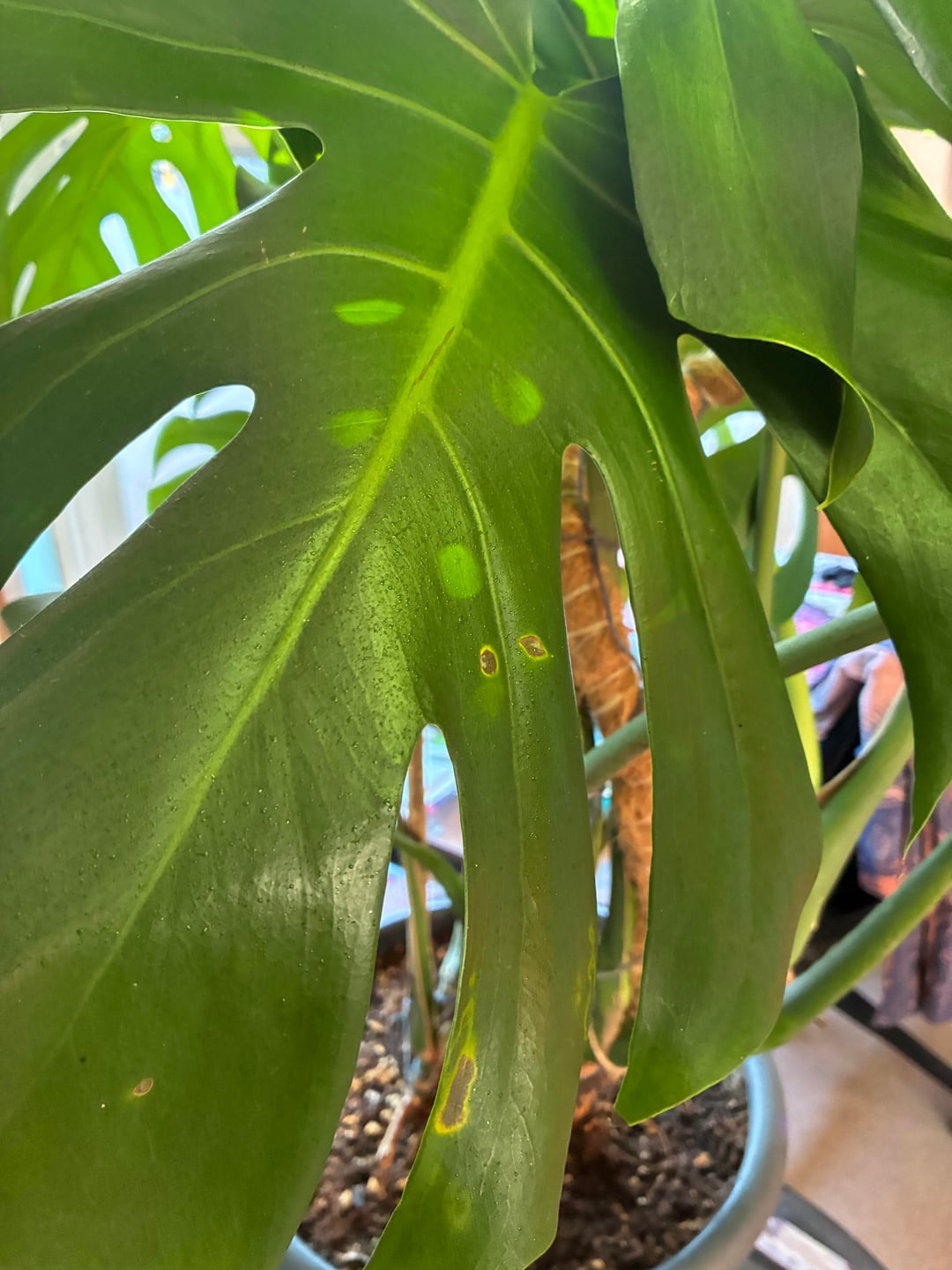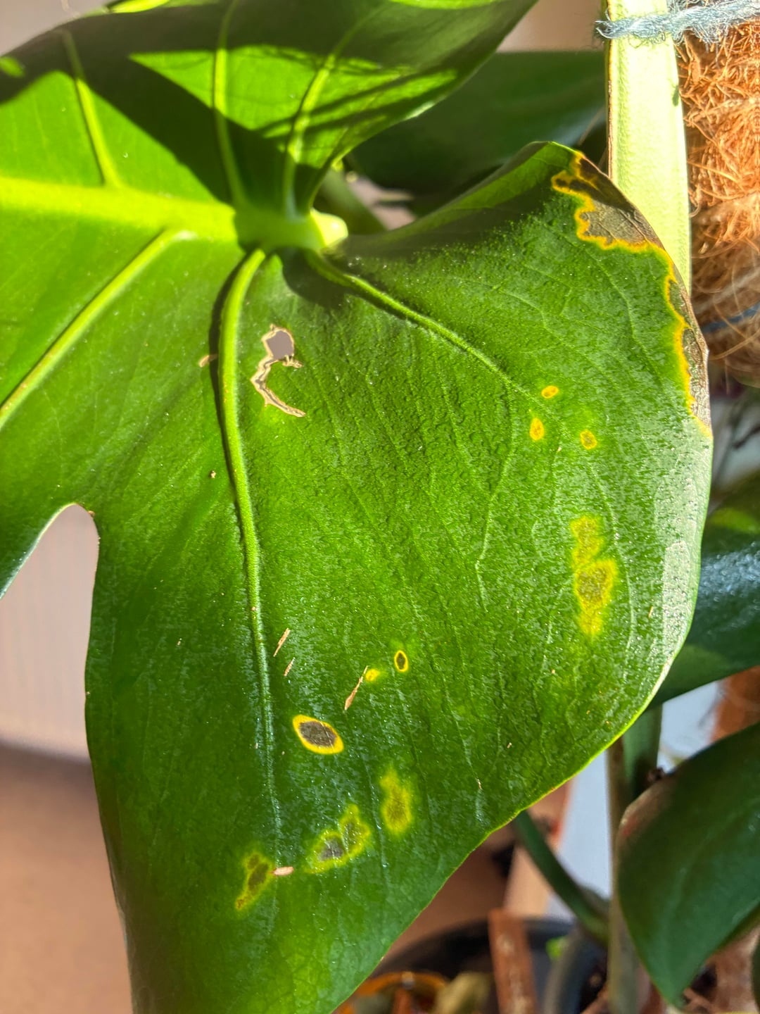 Ich kümmere mich um die Monstera meiner Mitbewohnerin und habe folgendes entdeckt: Was kann ich tun, um der Pflanze zu helfen?