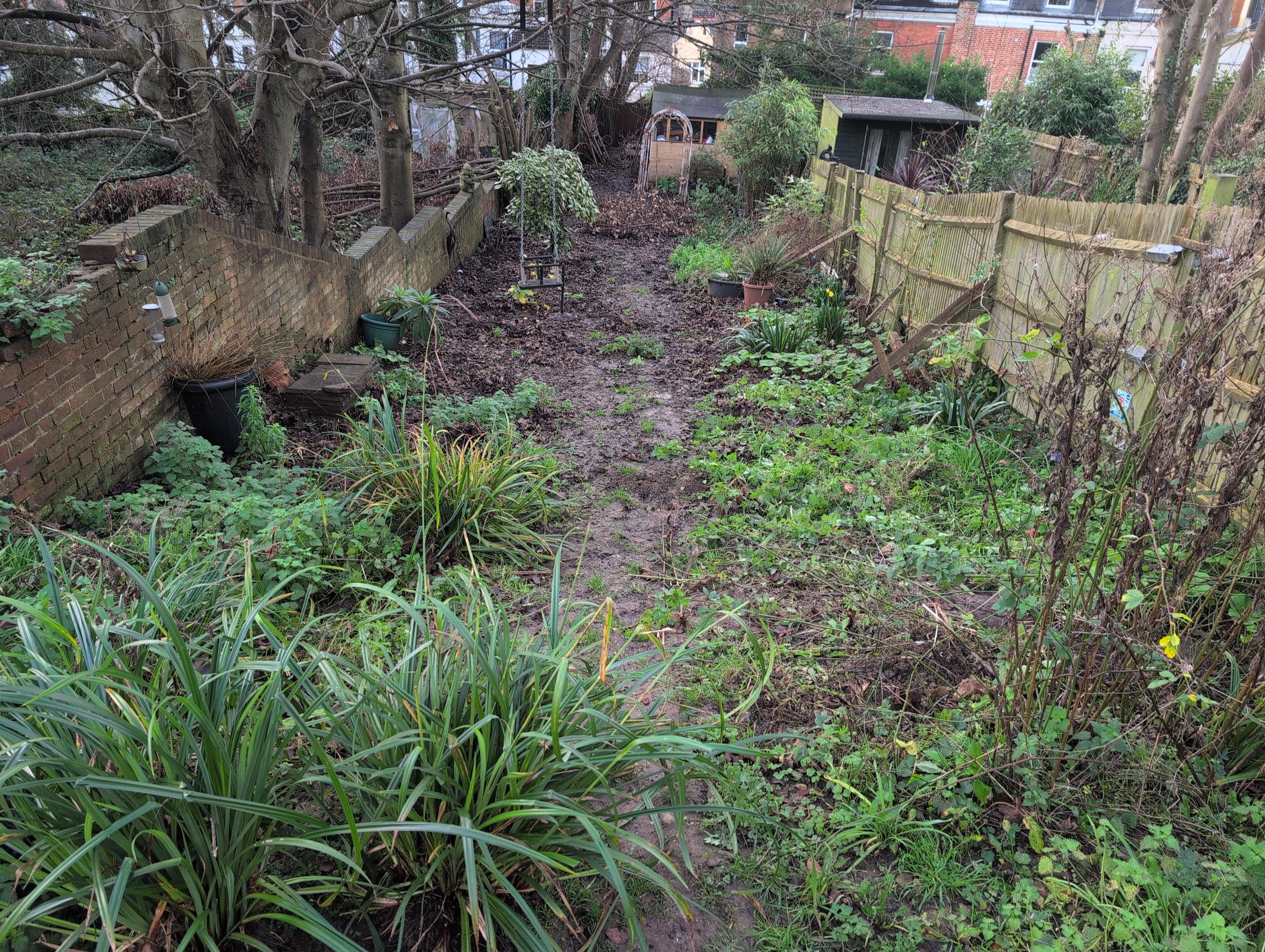Der Garten ist 40 m lang und 6 m breit, wobei das Foto vom Rand der Terrasse aus 8 m aufgenommen wurde. Der Schuppen ist 34 m lang.