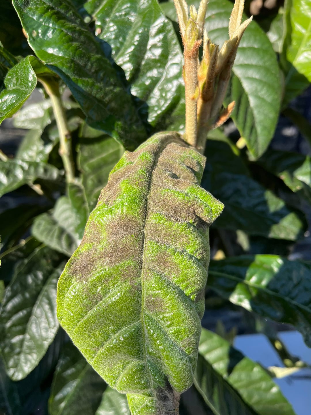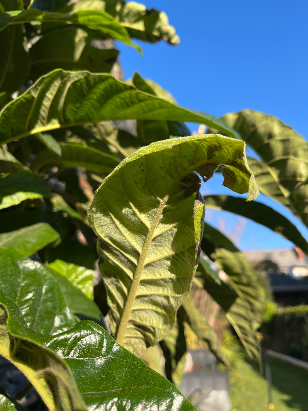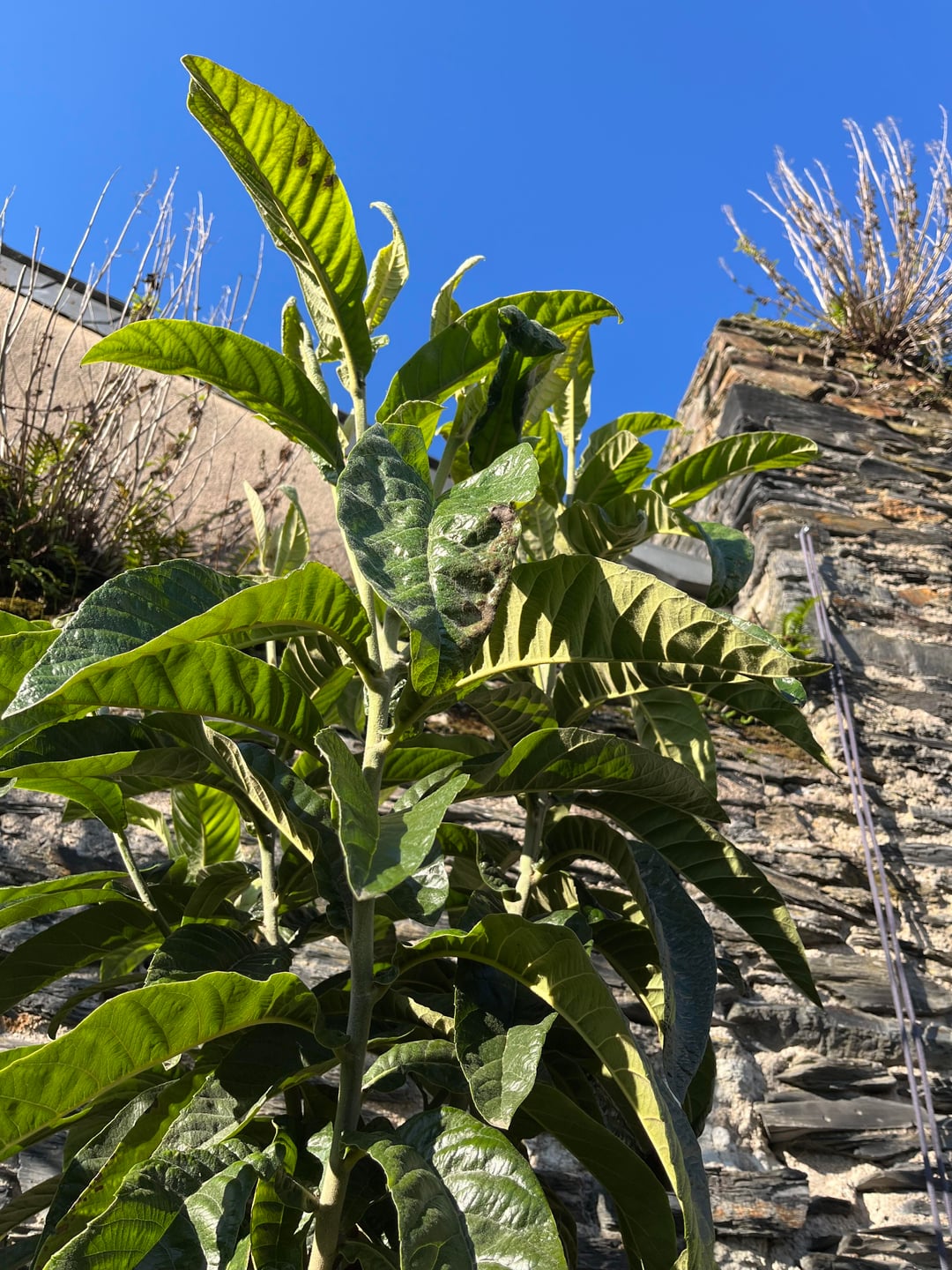 Mein Mispelbaum war majestätisch und blühte im Jahr 2022. Er erhielt einen Erhaltungsschnitt von dem Landschaftsgärtner, den ich im März 2023 hinzugezogen hatte. Seitdem habe ich schwarze/braune Flecken, wie Sie auf dem Foto sehen können, und die Blätter, die sich einrollen und schließlich abfallen. Ich habe ab 2024 und Anfang 2025 alle beschädigten Blätter entfernt.