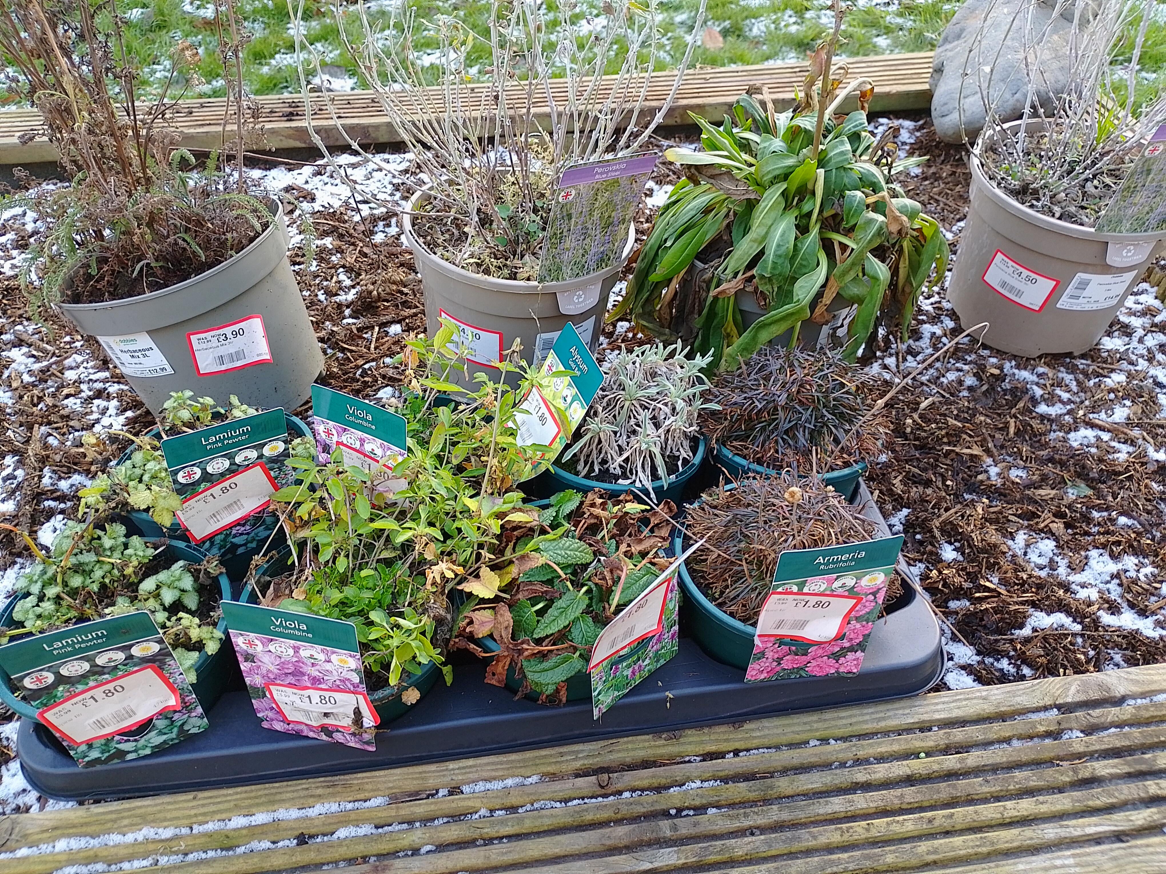 Ich bekam einen Gutschein im Wert von 30 £ für unseren örtlichen Laden geschenkt – rhymes with Bodies. Ich war etwas überrascht von den Preisen – 15 £ für einen Beutel Kompost, 7 £ für einen winzigen Beutel Pflanzkartoffeln usw. Ich hatte Mühe, den Gutschein auszugeben, bis ich den fast leeren und verlassenen reduzierten Bereich neben dem Container hinten draußen entdeckte. Einen Einkaufswagen gefüllt und die Daumen für den Frühling gedrückt. Der Boden ist fest gefroren, also etwas Pflege fürs Erste im Gewächshaus.
