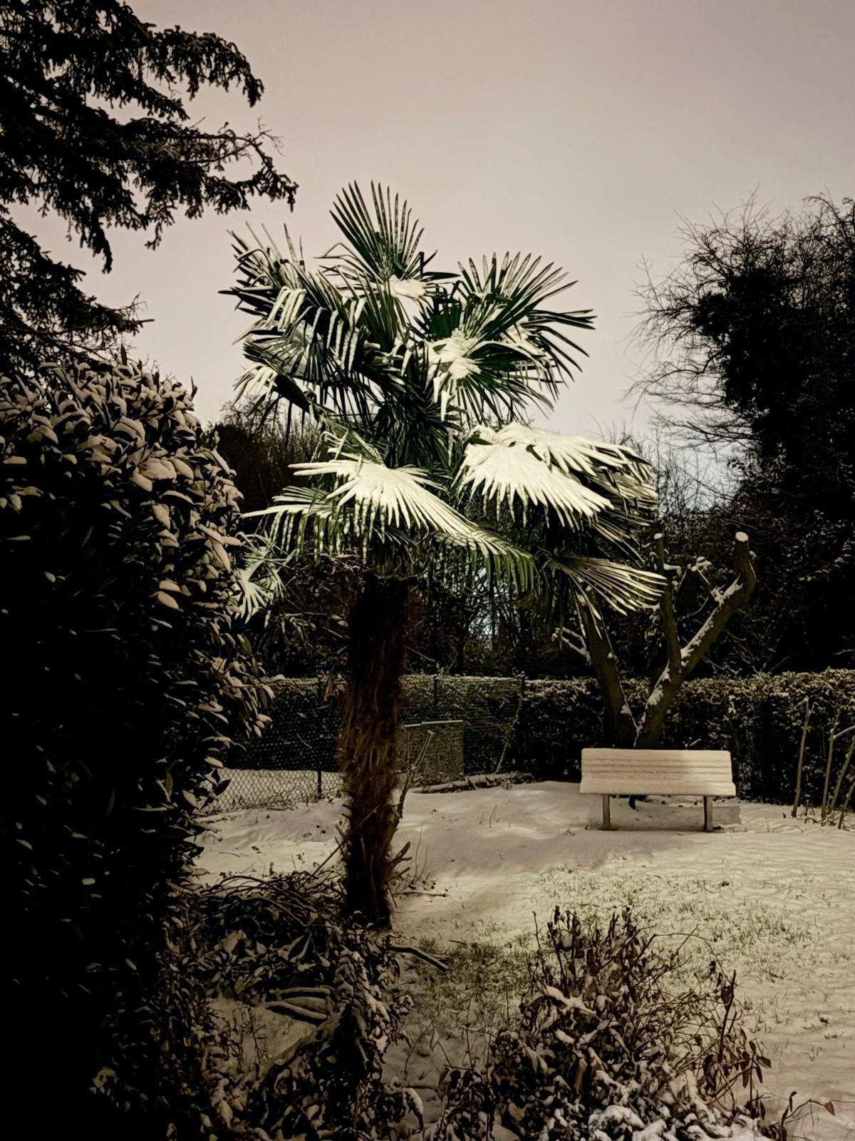 Viel in Deutschland unterwegs gewesen. Vermutlich eine Chinesische Hanfpalme , habe ich schon so mit Schnee gesehen . Der Besitzer hat gemeint das er wenn es sehr kalt wird versucht vorübergehend eine Plane gegen den Wind darüber zu werfen. Wenn er es noch schafft bei der Größe.Aber bis minus 10°C macht er nichts mehr.Palme zu Groß