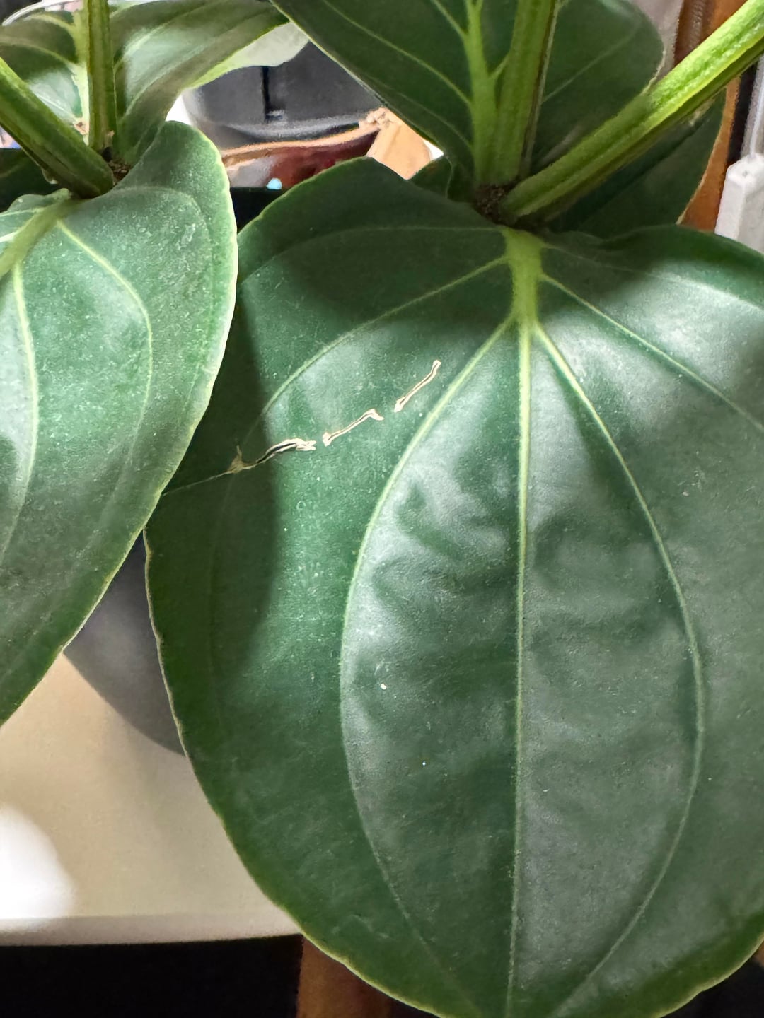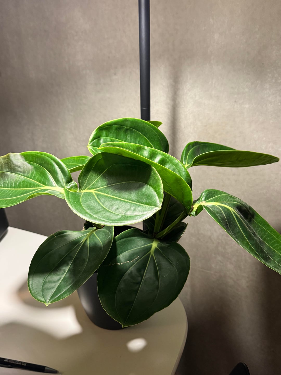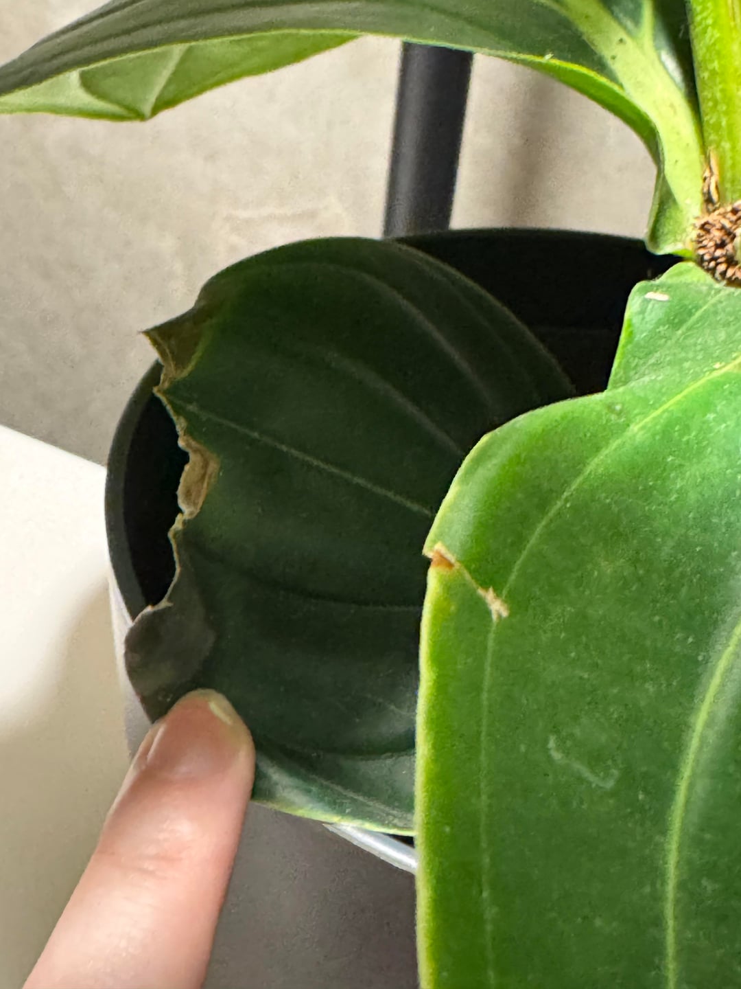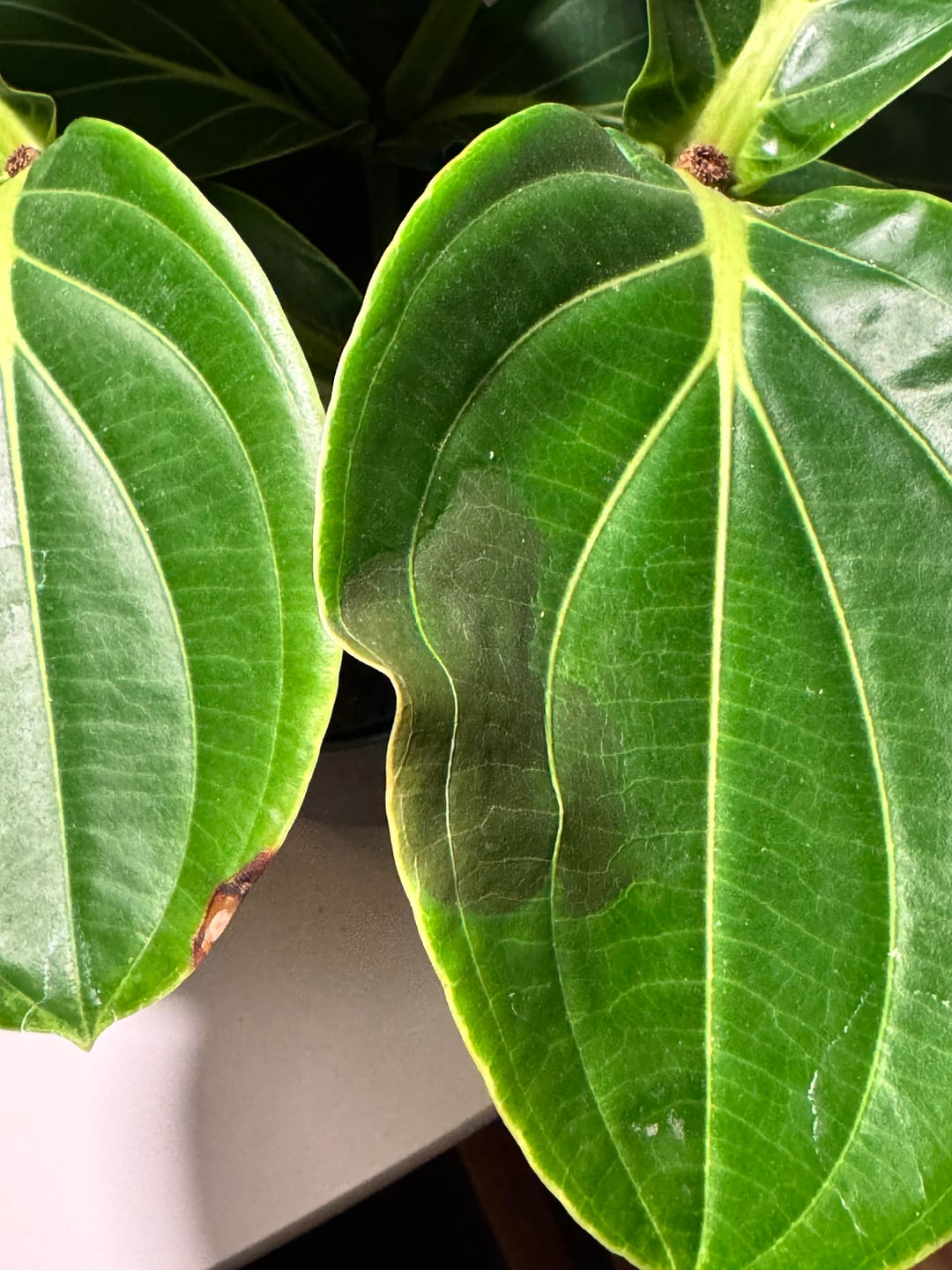 Leider hat sie braune Flecken und kleine Risse an den Blättern. Ich sprühe sie regelmäßig ein und habe sie jetzt zu einer Lampe gestellt da meine Wohnung kein direktes Sonnenlicht bekommt. Ich gieße ca. 1-max 2 mal die Woche und extra nicht mit Leitungswasser da wir sehr viel Kalk im Wasser haben.