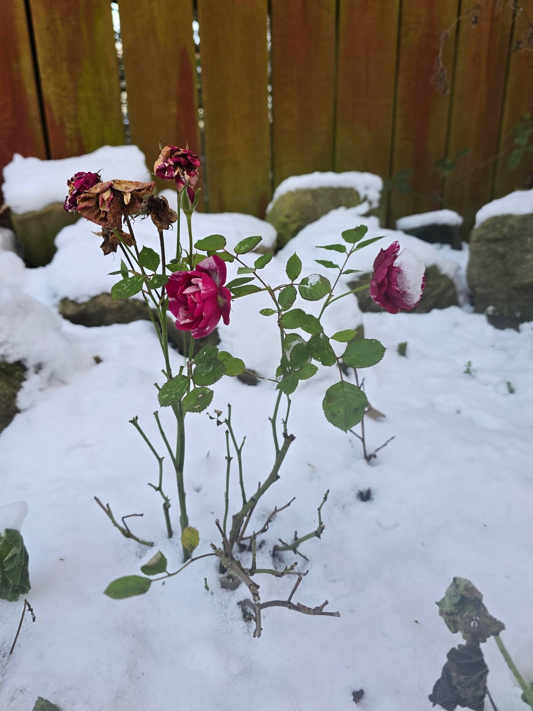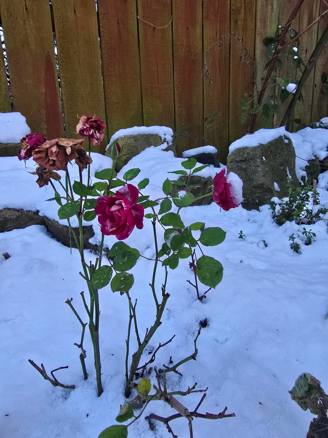 Ich bin es nicht gewohnt, schneebedeckte Rosen im Garten zu sehen. Ich war gerade da und habe die letzten Gladiolen abgeschnitten, die noch nicht gelb geworden waren, aber ich dachte, es sei an der Zeit. Alle Tulpen und Narzissen, die früher sprießen, wurden hoffentlich an ihren Platz erinnert und sind robust genug, um nicht abzusterben.