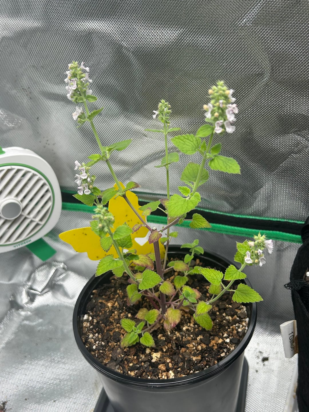 Catnip. If you don’t want it in your garden, get rid of it. If I remember correctly, it spreads quite aggressively.