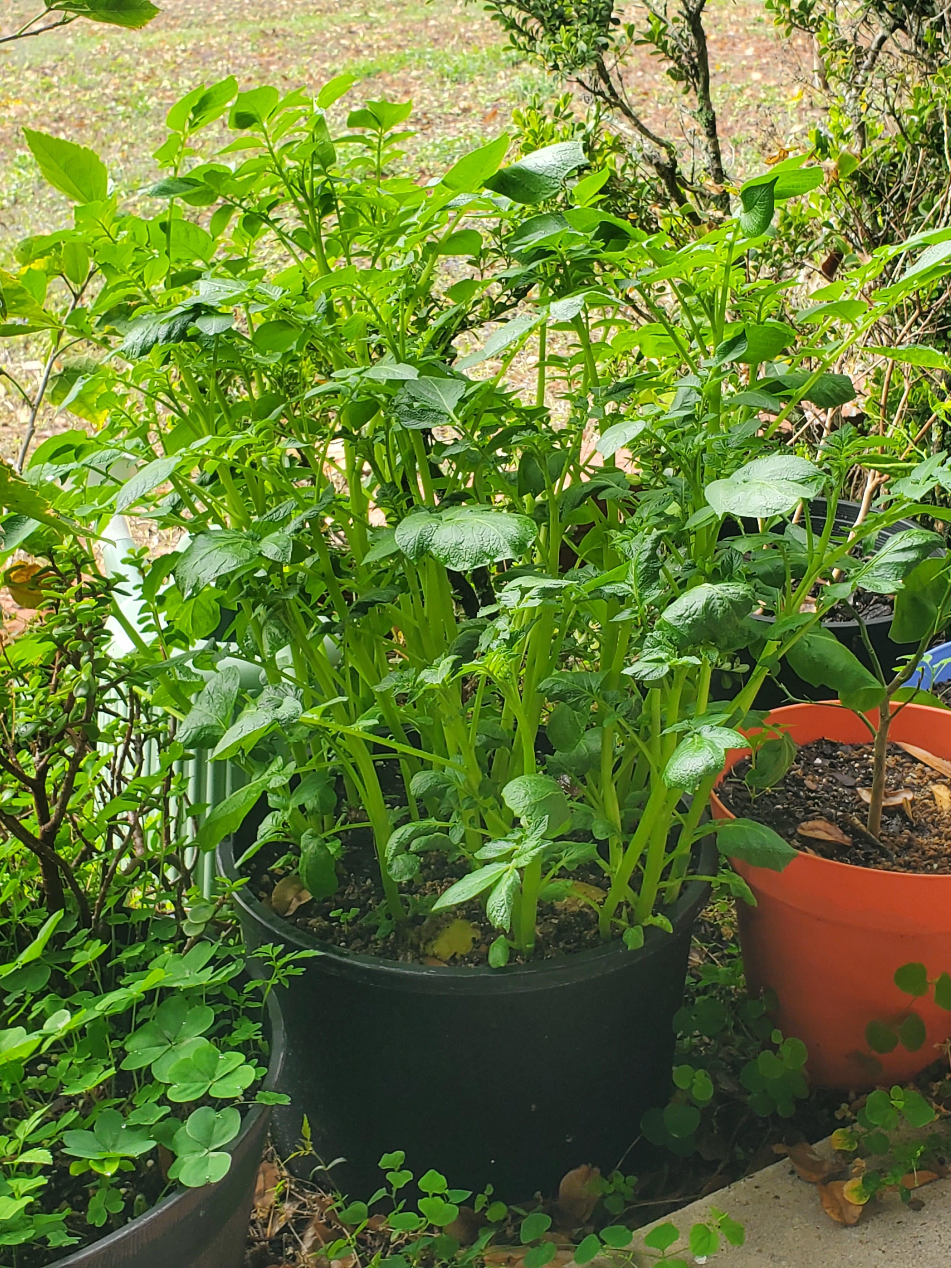 Ich habe diese keimenden gelben Kartoffeln gepflanzt und sie gedeihen in diesem Topf, aber ich weiß nicht, ob ich sie in einen größeren Topf umpflanzen soll oder was ich als nächstes tun soll. Von: FireballBluey