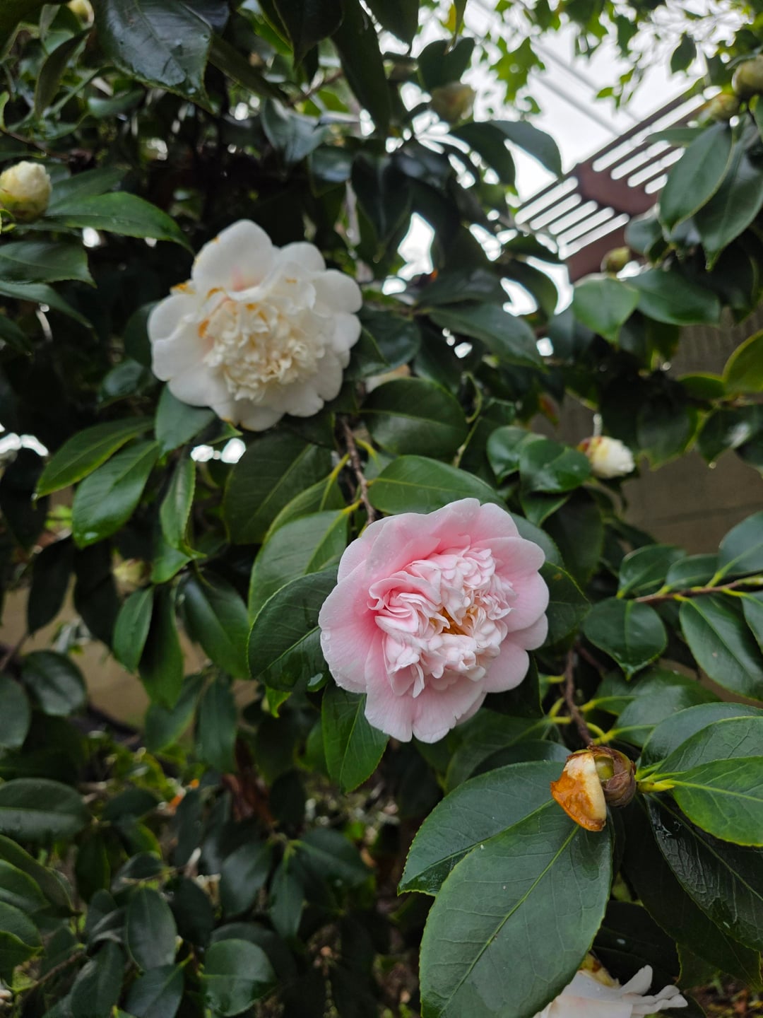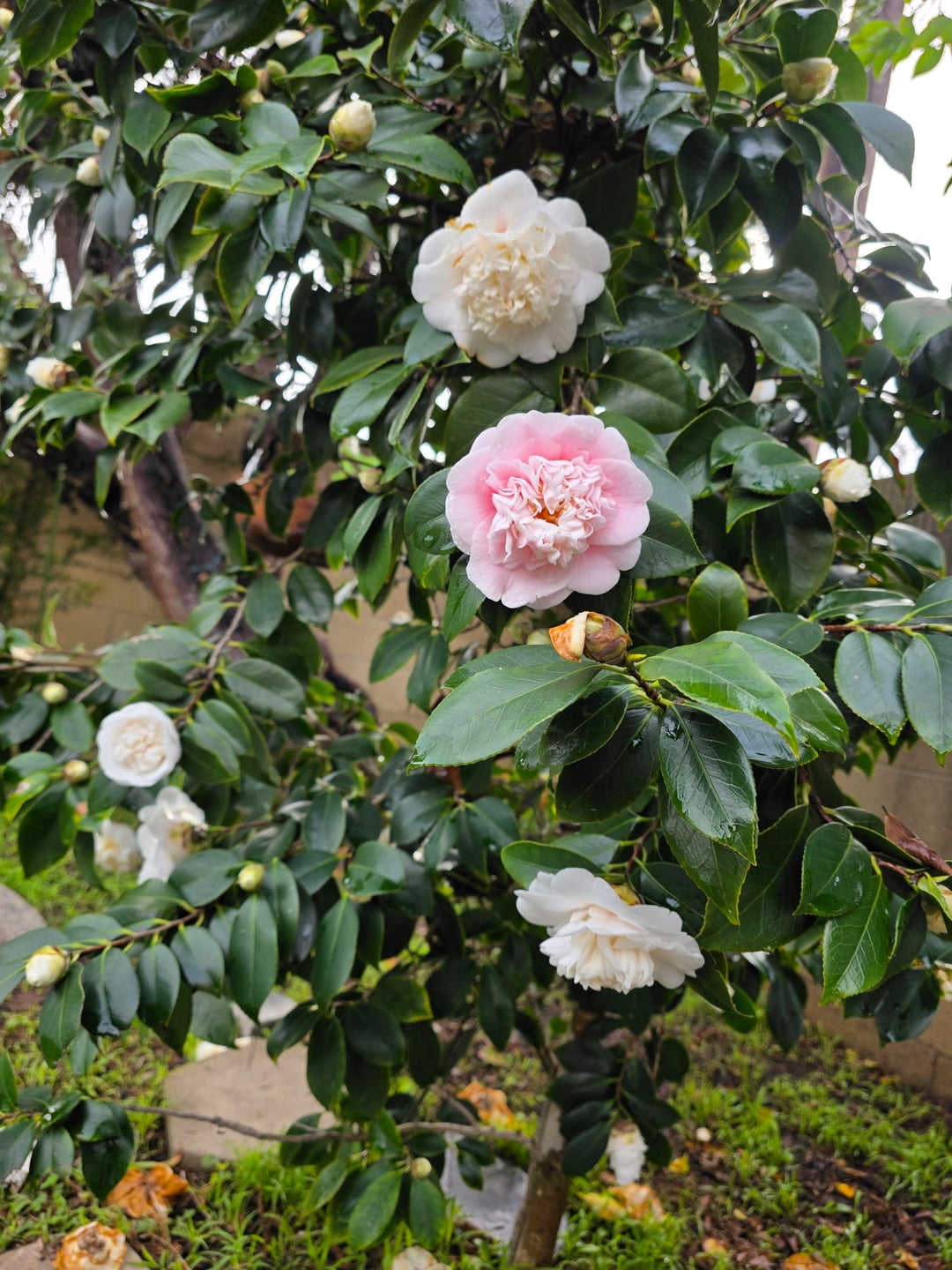 Ich ging in meinem Garten spazieren und bemerkte, dass aus meinem weißen Kamelienstrauch eine zufällige rosa Blüte hervorging! Der Rest der Blüten am Strauch ist bis auf diese weiß! So zufällig, aber es ist sehr schön.
