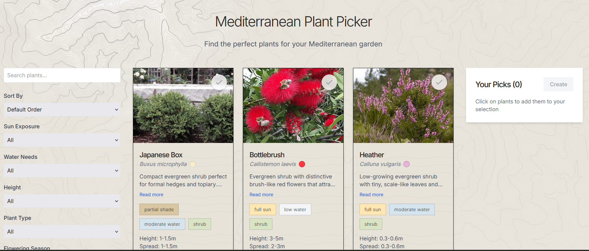 Ich baue einen Pflanzenpflücker für mediterrane Pflanzen. Das Tool verfügt über viele Filter, ein visuelles Vergleichstool für Höhe und Ausbreitung, einen Budgetsimulator und einen Visualisierer für die Blütezeit.