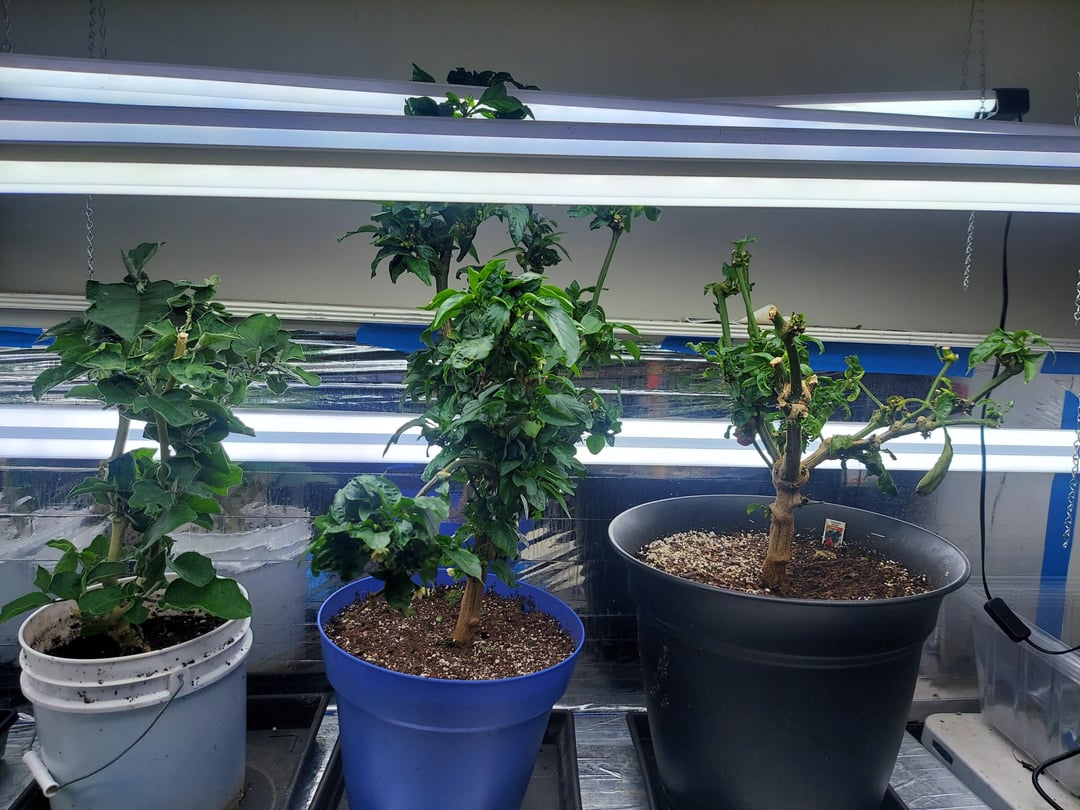 Meine Paprika und Auberginen blühen und blühen immer noch bei 60–75 Grad im Keller.